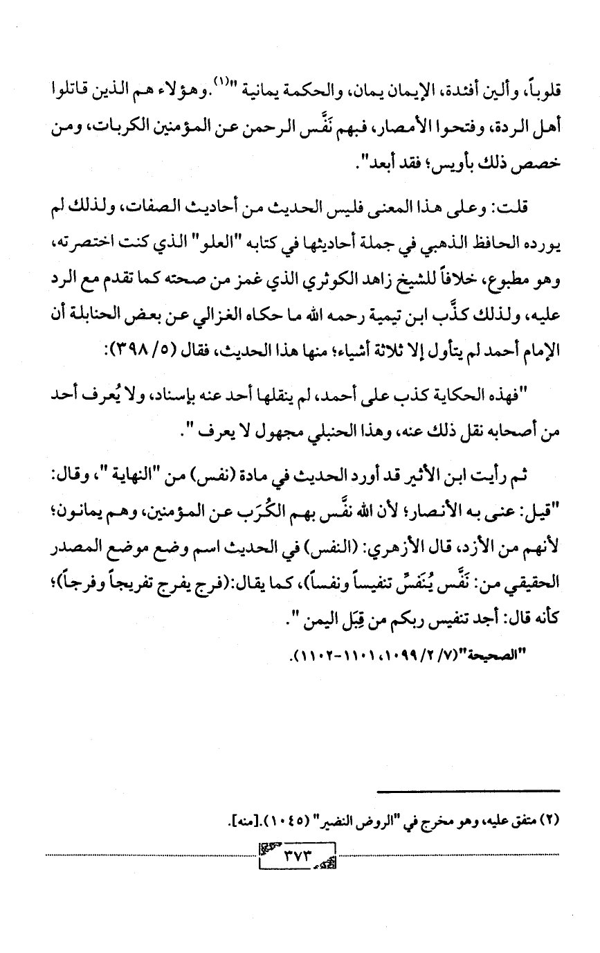 قلت: وعلى هذا المعنى فليس الحديث من أحاديث الصفات، ولذلك لم يورده الحافظ الذهبي في جملة أحاديثها في كتابه "العلو" الذي كنت اختصرته، وهو مطبوع، خلافاً للشيخ زاهد الكوثري الذي غمز من صحته كما تقدم مع الرد عليه، ولذلك كذَّب ابن تيمية رحمه الله ما حكاه الغزالي عن بعض الحنابلة أن الإمام أحمد لم يتأول إلا ثلاثة أشياء؛ منها هذا الحديث، فقال (5/ 398):
