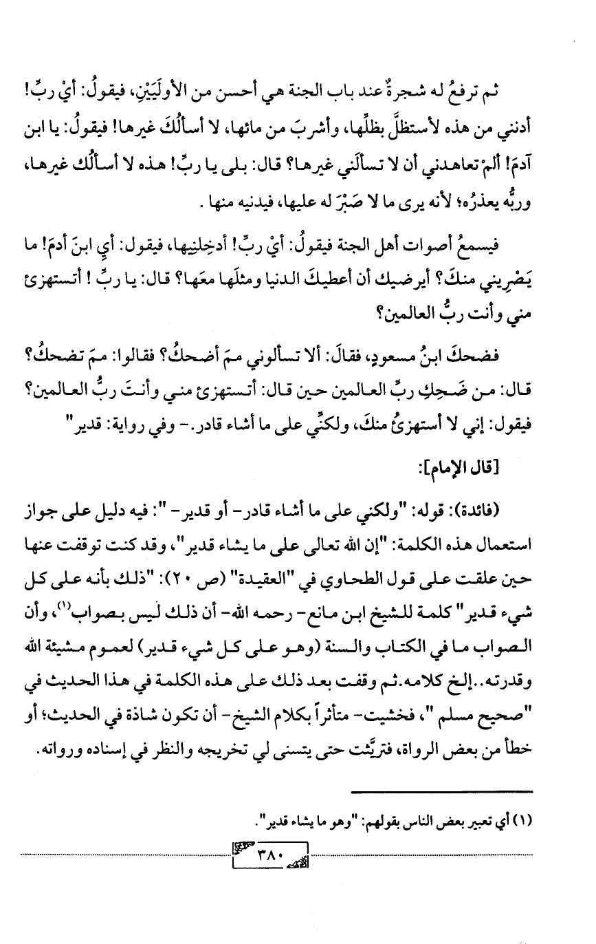 (فائدة): قوله: "ولكني على ما أشاء قادر- أو قدير- ": فيه دليل على جواز استعمال هذه الكلمة: "إن الله تعالى على ما يشاء قدير"، وقد كنت توقفت عنها حين علقت على قول الطحاوي في "العقيدة" (ص 20): "ذلك بأنه على كل شيء قدير" كلمة للشيخ ابن مانع- رحمه الله- أن ذلك ليس بصواب (¬1)، وأن الصواب ما في الكتاب والسنة (وهو على كل شيء قدير) لعموم مشيئة الله وقدرته .. إلخ كلامه. ثم وقفت بعد ذلك على هذه الكلمة في هذا الحديث في "صحيح مسلم "، فخشيت- متأثراً بكلام الشيخ- أن تكون شاذة في الحديث؛ أو خطأ من بعض الرواة، فتريَّثت حتى يتسنى لي تخريجه والنظر في إسناده ورواته.