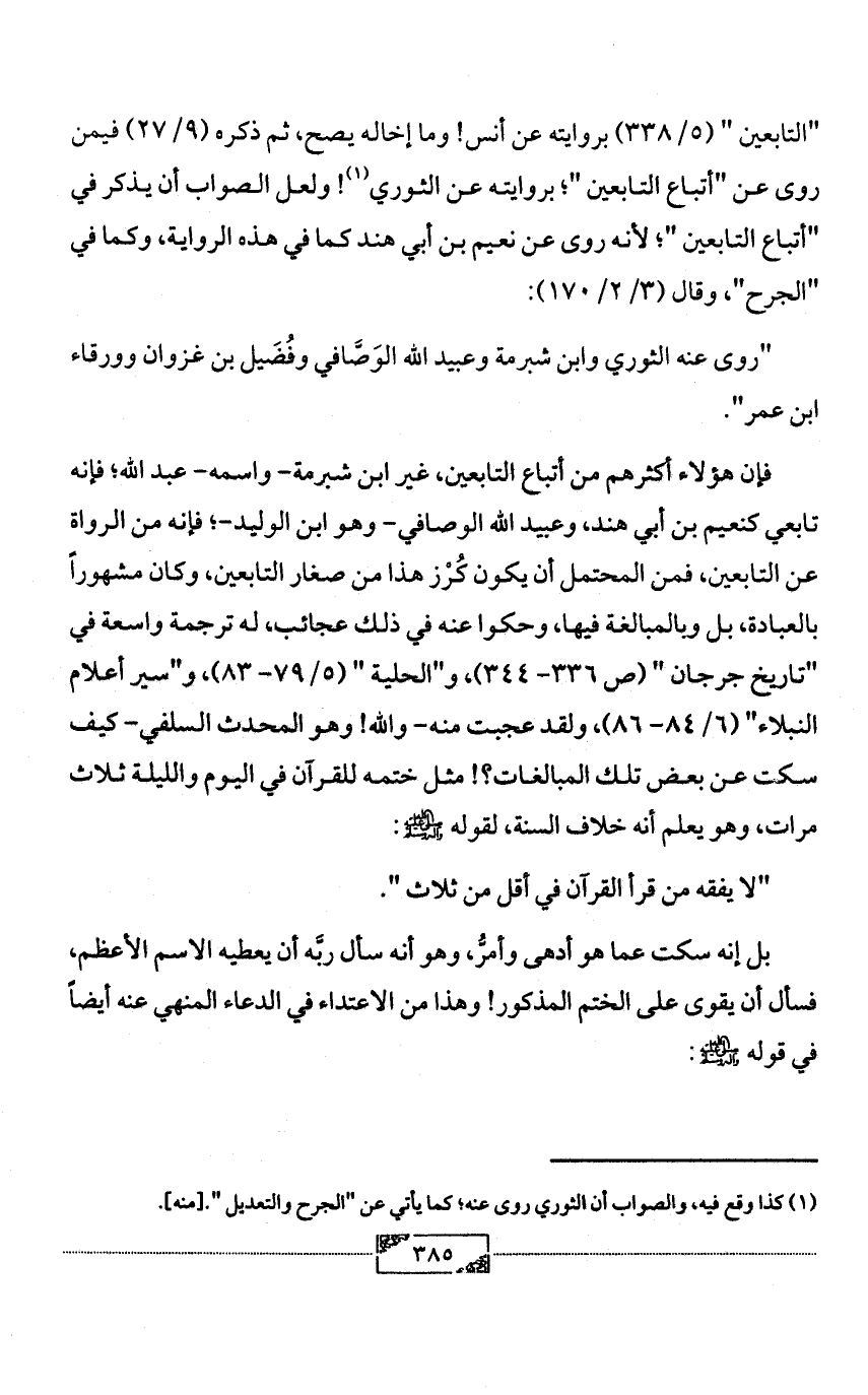 فإن هؤلاء أكثرهم من أتباع التابعين، غير ابن شبرمة- واسمه- عبد الله؛ فإنه تابعي كنعيم بن أبي هند، وعبيد الله الوصافي- وهو ابن الوليد-؛ فإنه من الرواة عن التابعين، فمن المحتمل أن يكون كُرْز هذا من صغار التابعين، وكان مشهوراً بالعبادة، بل وبالمبالغة فيها، وحكوا عنه في ذلك عجائب، له ترجمة واسعة في "تاريخ جرجان " (ص 336 - 344)، و"الحلية " (5/ 79 - 83)، و"سير أعلام النبلاء" (6/ 84 - 86)، ولقد عجبت منه- والله! وهو المحدث السلفي- كيف سكت عن بعض تلك المبالغات؟! مثل ختمه للقرآن في اليوم والليلة ثلاث مرات، وهو يعلم أنه خلاف السنة، لقوله - صلى الله عليه وآله وسلم -:
