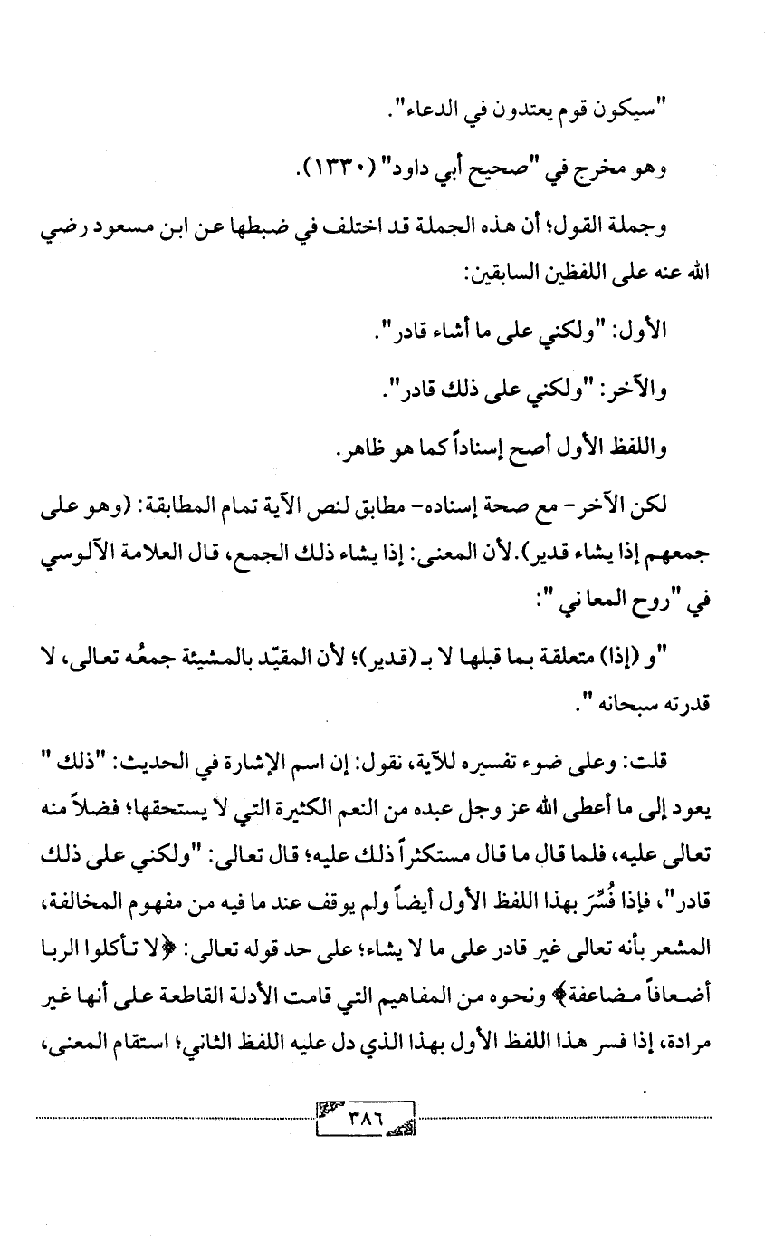 قلت: وعلى ضوء تفسيره للآية، نقول: إن اسم الإشارة في الحديث: "ذلك " يعود إلى ما أعطى الله عز وجل عبده من النعم الكثيرة التي لا يستحقها؛ فضلاً منه تعالى عليه، فلما قال ما قال مستكثراً ذلك عليه؛ قال تعالى: "ولكني على ذلك قادر"، فإذا فُسِّرَ بهذا اللفظ الأول أيضاً ولم يوقف عند ما فيه من مفهوم المخالفة، المشعر بأنه تعالى غير قادر على ما لا يشاء؛ على حد قوله تعالى: {لا تأكلوا الربا أضعافاً مضاعفة} ونحوه من المفاهيم التي قامت الأدلة القاطعة على أنها غير مرادة، إذا فسر هذا اللفظ الأول بهذا الذي دل عليه اللفظ الثاني؛ استقام المعنى،