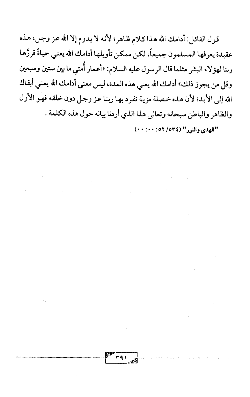 قول القائل: أدامك الله هذا كلام ظاهر؛ لأنه لا يدوم إلا الله عز وجل، هذه عقيدة يعرفها المسلمون جميعاً، لكن ممكن تأويلها أدامك الله يعني حياةً قررَّها ربنا لهؤلاء البشر مثلما قال الرسول عليه السلام: «أعمار أُمتي ما بين ستين وسبعين وقل من يجوز ذلك» أدامك الله يعني هذه المدة، ليس معنى أدامك الله يعني أبقاك الله إلى الأبد؛ لأن هذه خصلة مزية تفرد بها ربنا عز وجل دون خلقه فهو الأول والظاهر والباطن سبحانه وتعالى هذا الذي أردنا بيانه حول هذه الكلمة.