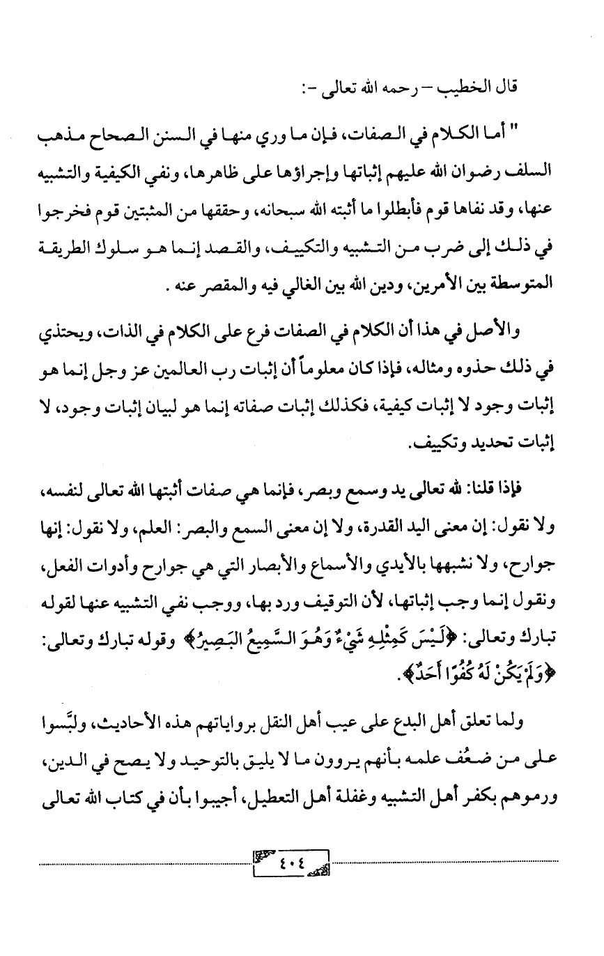 " أما الكلام في الصفات، فإن ما وري منها في السنن الصحاح مذهب السلف رضوان الله عليهم إثباتها وإجراؤها على ظاهرها، ونفي الكيفية والتشبيه عنها، وقد نفاها قوم فأبطلوا ما أثبته الله سبحانه، وحققها من المثبتين قوم فخرجوا في ذلك إلى ضرب من التشبيه والتكييف، والقصد إنما هو سلوك الطريقة المتوسطة بين الأمرين، ودين الله بين الغالي فيه والمقصر عنه.
