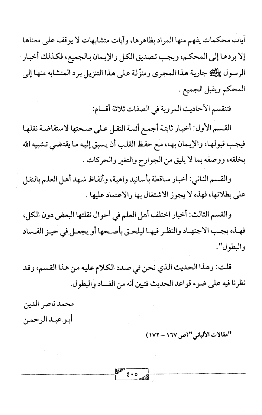 القسم الأول: أخبار ثابتة أجمع أئمة النقل على صحتها لاستفاضة نقلها فيجب قبولها، والإيمان بها، مع حفظ القلب أن يسبق إليه ما يقتضي تشبيه الله بخلقه، ووصفه بما لا يليق من الجوارح والتغير والحركات.