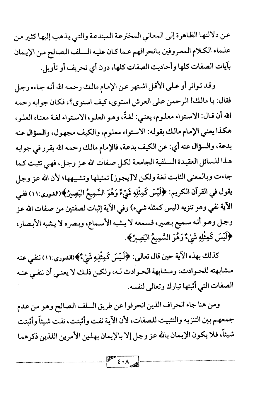 وقد تواتر أو على الأقل اشتهر عن الإمام مالك رحمه الله أنه جاءه رجل فقال: يا مالك! الرحمن على العرش استوى، كيف استوى؟، فكان جوابه رحمه الله أن قال: الاستواء معلوم، يعني: لغةً، وهو العلو، الاستواء لغة معناه العلو، هكذا يعني الإمام مالك بقوله: الاستواء معلوم، والكيف مجهول، والسؤال عنه بدعة، والسؤال عنه أي: عن الكيف بدعة، فالإمام مالك رحمه الله يقرر في جوابه هذا للسائل العقيدة السلفية الجامعة لكل صفات الله عز وجل، فهي تثبت كما جاءت وبالمعنى الثابت لغة ولكن لا [يجوز] تمثيلها وتشبيهها؛ لأن الله عز وجل يقول في القرآن الكريم: {لَيْسَ كَمِثْلِهِ شَيْءٌ وَهُوَ السَّمِيعُ البَصِيرُ} (الشورى:11) ففي الآية نفي وهو تنزيه (ليس كمثله شيء) وفي الآية إثبات لصفتين من صفات الله عز وجل وهو أنه سميع بصير، فسمعه لا يشبه الأسماع، وبصره لا يشبه الأبصار، {لَيْسَ كَمِثْلِهِ شَيْءٌ وَهُوَ السَّمِيعُ البَصِيرُ}.