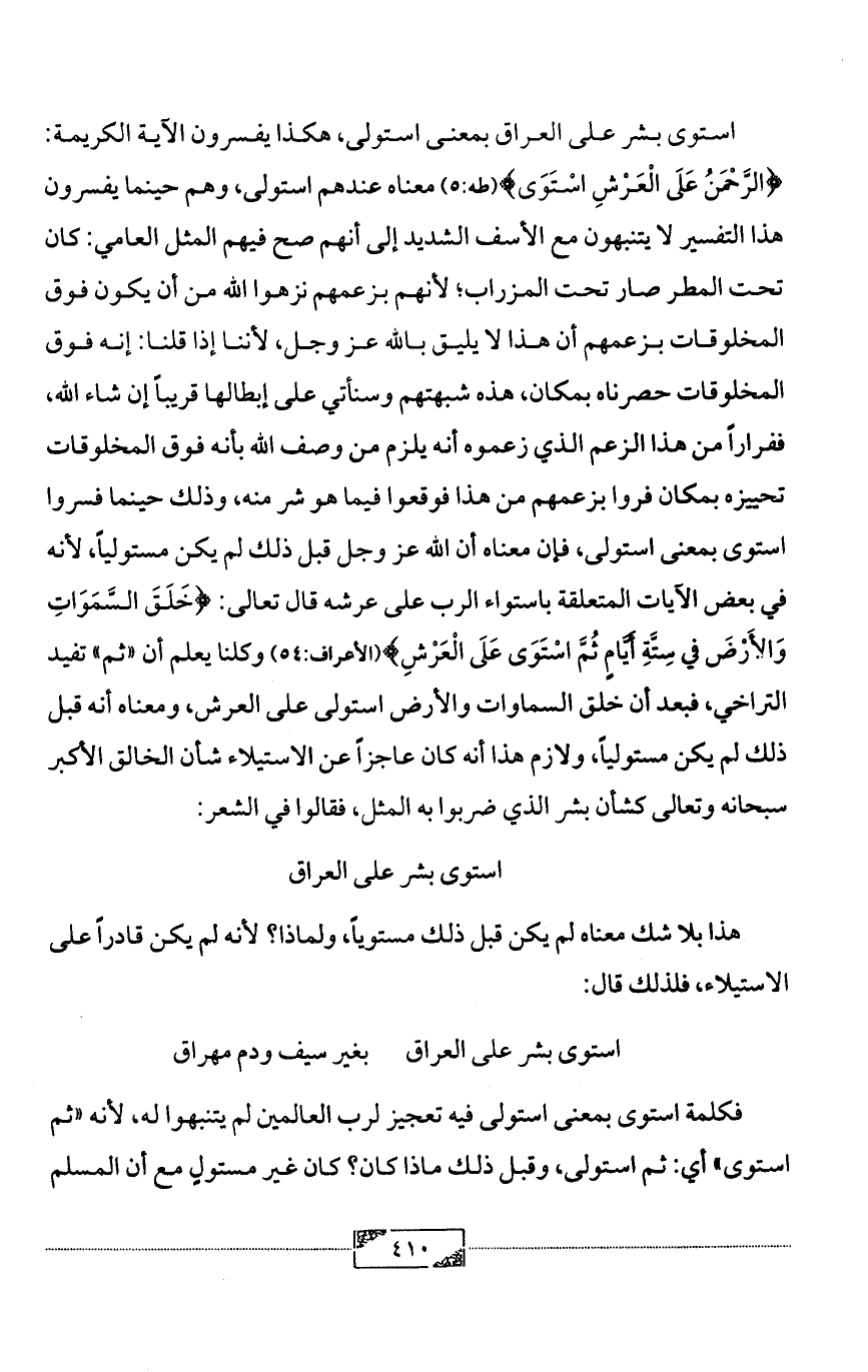 استوى بشر على العراق بمعنى استولى، هكذا يفسرون الآية الكريمة: {الرَّحْمَنُ عَلَى الْعَرْشِ اسْتَوَى} (طه:5) معناه عندهم استولى، وهم حينما يفسرون هذا التفسير لا يتنبهون مع الأسف الشديد إلى أنهم صح فيهم المثل العامي: كان تحت المطر صار تحت المزراب؛ لأنهم بزعمهم نزهوا الله من أن يكون فوق المخلوقات بزعمهم أن هذا لا يليق بالله عز وجل، لأننا إذا قلنا: إنه فوق المخلوقات حصرناه بمكان، هذه شبهتهم وسنأتي على إبطالها قريباً إن شاء الله، ففراراً من هذا الزعم الذي زعموه أنه يلزم من وصف الله بأنه فوق المخلوقات تحييزه بمكان فروا بزعمهم من هذا فوقعوا فيما هو شر منه، وذلك حينما فسروا استوى بمعنى استولى، فإن معناه أن الله عز وجل قبل ذلك لم يكن مستولياً، لأنه في بعض الآيات المتعلقة باستواء الرب على عرشه قال تعالى: {خَلَقَ السَّمَوَاتِ وَالأَرْضَ في سِتَّةِ أَيَّامٍ ثُمَّ اسْتَوَى عَلَى الْعَرْشِ} (الأعراف:54) وكلنا يعلم أن «ثم» تفيد التراخي، فبعد أن خلق السماوات والأرض استولى على العرش، ومعناه أنه قبل ذلك لم يكن مستولياً، ولازم هذا أنه كان عاجزاً عن الاستيلاء شأن الخالق الأكبر سبحانه وتعالى كشأن بشر الذي ضربوا به المثل، فقالوا في الشعر: