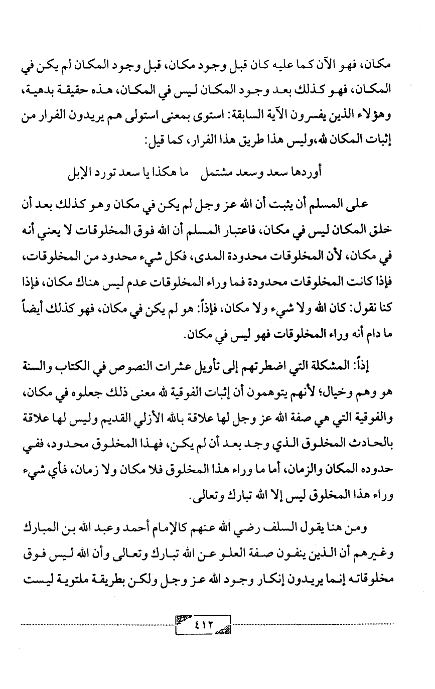 على المسلم أن يثبت أن الله عز وجل لم يكن في مكان وهو كذلك بعد أن خلق المكان ليس في مكان، فاعتبار المسلم أن الله فوق المخلوقات لا يعني أنه في مكان، لأن المخلوقات محدودة المدى، فكل شيء محدود من المخلوقات، فإذا كانت المخلوقات محدودة فما وراء المخلوقات عدم ليس هناك مكان، فإذا كنا نقول: كان الله ولا شيء ولا مكان، فإذاً: هو لم يكن في مكان، فهو كذلك أيضاً ما دام أنه وراء المخلوقات فهو ليس في مكان.