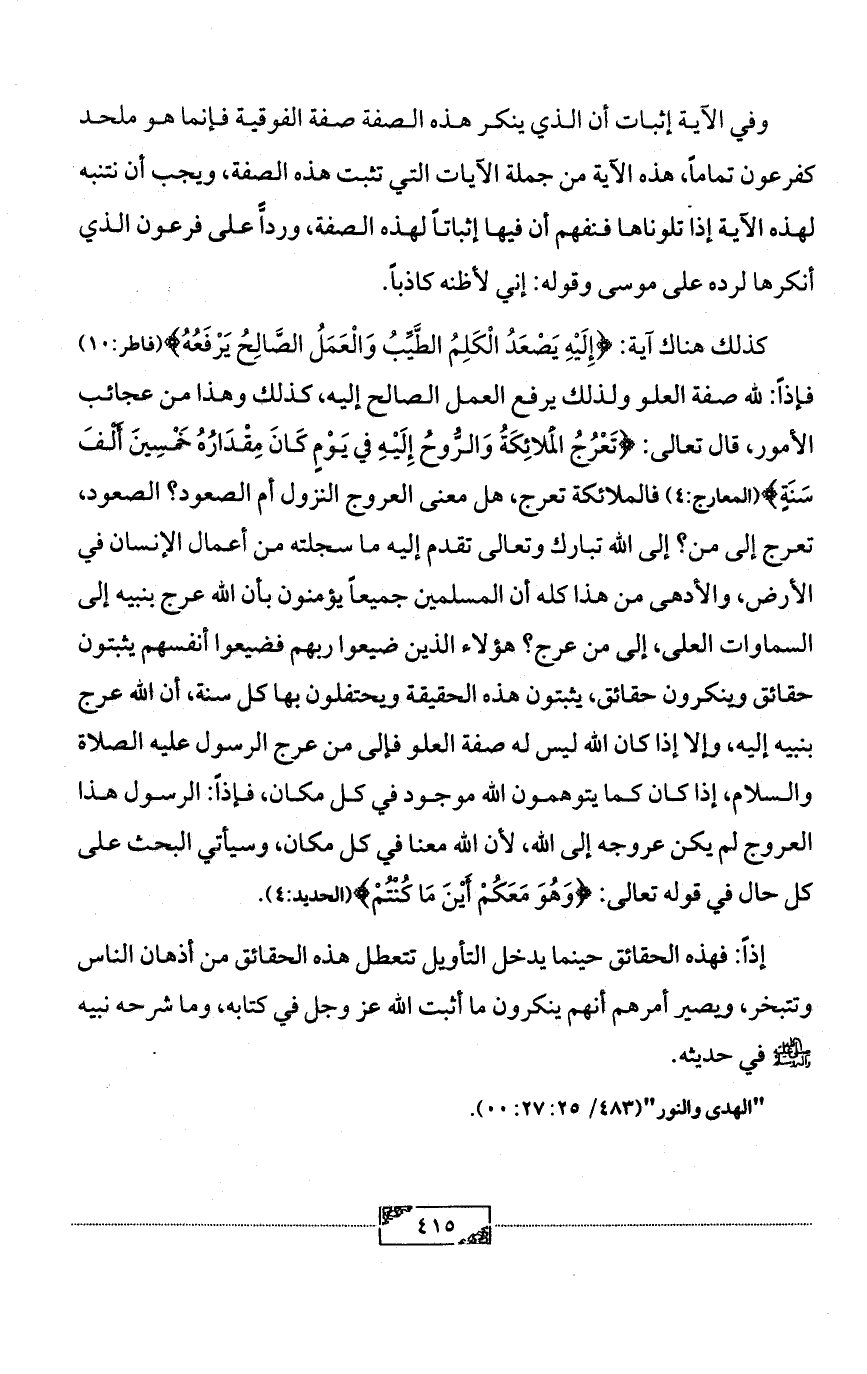 كذلك هناك آية: {إِلَيْهِ يَصْعَدُ الْكَلِمُ الطَّيِّبُ وَالْعَمَلُ الصَّالِحُ يَرْفَعُهُ} (فاطر:10) فإذاً: لله صفة العلو ولذلك يرفع العمل الصالح إليه، كذلك وهذا من عجائب الأمور، قال تعالى: {تَعْرُجُ الْمَلائِكَةُ وَالرُّوحُ إِلَيْهِ في يَوْمٍ كَانَ مِقْدَارُهُ خَمْسِينَ أَلْفَ سَنَةٍ} (المعارج:4) فالملائكة تعرج، هل معنى العروج النزول أم الصعود؟ الصعود، تعرج إلى من؟ إلى الله تبارك وتعالى تقدم إليه ما سجلته من أعمال الإنسان في الأرض، والأدهى من هذا كله أن المسلمين جميعاً يؤمنون بأن الله عرج بنبيه إلى السماوات العلى، إلى من عرج؟ هؤلاء الذين ضيعوا ربهم فضيعوا أنفسهم يثبتون حقائق وينكرون حقائق، يثبتون هذه الحقيقة ويحتفلون بها كل سنة، أن الله عرج بنبيه إليه، وإلا إذا كان الله ليس له صفة العلو فإلى من عرج الرسول عليه الصلاة والسلام، إذا كان كما يتوهمون الله موجود في كل مكان، فإذاً: الرسول هذا العروج لم يكن عروجه إلى الله، لأن الله معنا في كل مكان، وسيأتي البحث على كل حال في قوله تعالى: {وَهُوَ مَعَكُمْ أَيْنَ مَا كُنْتُمْ} (الحديد:4).