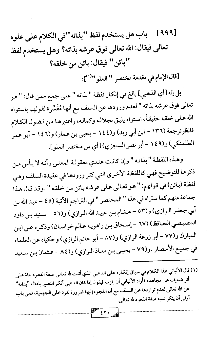 (¬1) قال الألباني هذا الكلام في سياق إنكاره على الذهبي الذي أثبت لله تعالى صفة القعود بناءً على أثر ضعيف عن مجاهد, فأراد الألباني أن يلزمه فيقول إذا كان الذهبي أنكر التعبير بلفظه "بذاته" عن الله تعالى لعدم تواردها عن السلف مع أن اللجوء إليها ضرورة للرد على الجهمية، فمن باب أولى أن ينكر نسبه صفة القعود لله تعالى.