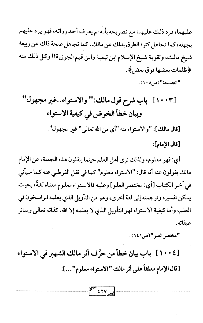 [1004] باب بيان خطأ من حرَّف أثر مالك الشهير في الاستواء