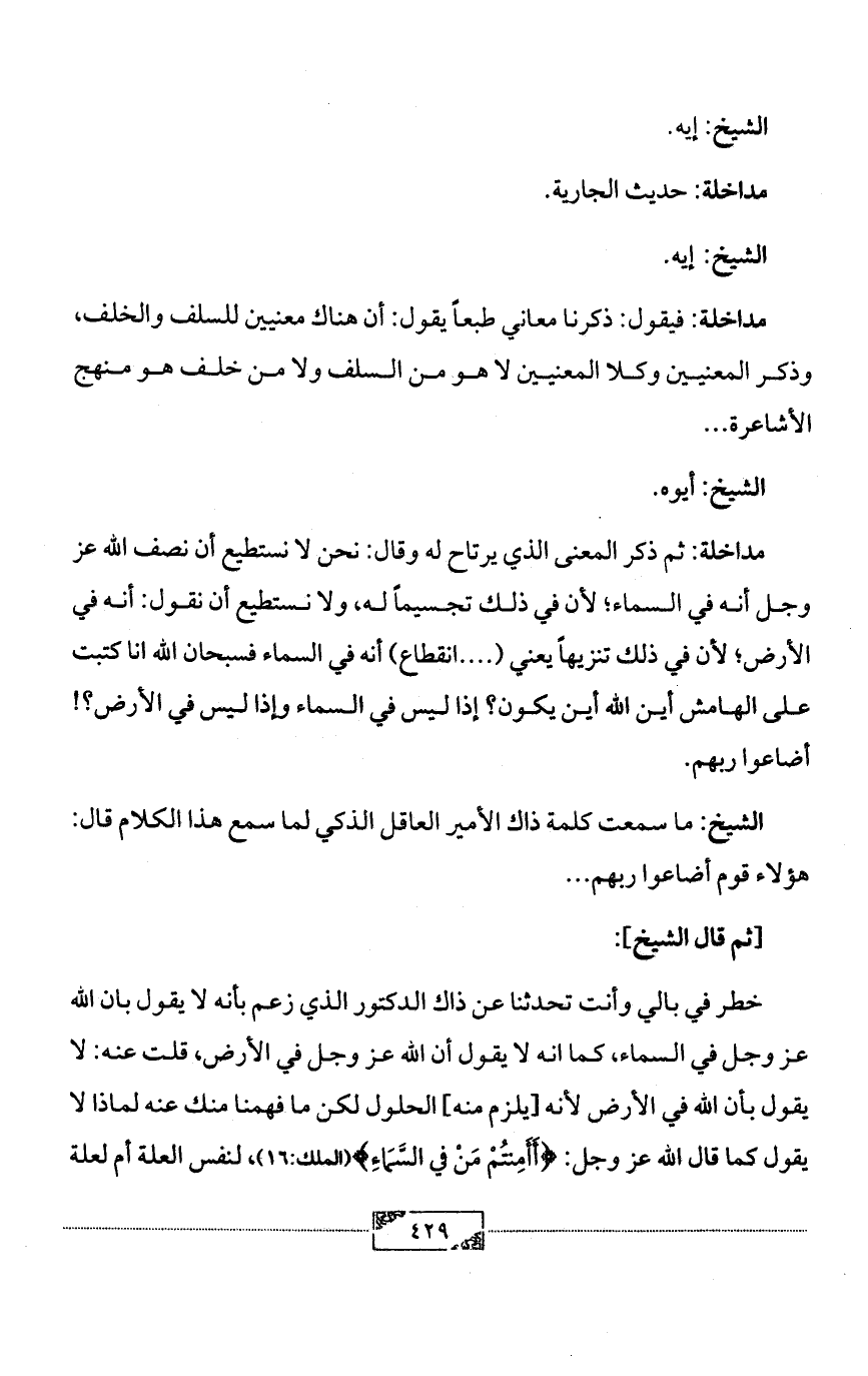 مداخلة: ثم ذكر المعنى الذي يرتاح له وقال: نحن لا نستطيع أن نصف الله عز وجل أنه في السماء؛ لأن في ذلك تجسيماً له، ولا نستطيع أن نقول: أنه في الأرض؛ لأن في ذلك تنزيهاً يعني ( .... انقطاع) أنه في السماء فسبحان الله انا كتبت على الهامش أين الله أين يكون؟ إذا ليس في السماء وإذا ليس في الأرض؟! أضاعوا ربهم.