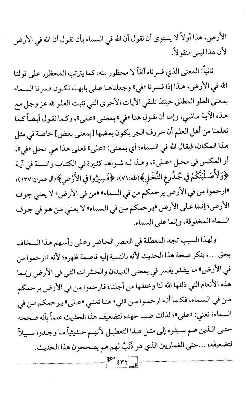 ولهذا السبب تجد المعطلة في العصر الحاضر وعلى رأسهم هذا السخاف بحق ... ، ينكر صحة هذا الحديث لأنه بالنسبة إليه قاصمة ظهره؛ لأنه «ارحموا من في الأرض» ما بيقدر يفسر في بمعنى الديدان والحشرات التي في الأرض وإنما هذه الأنعام التي ذللها الله لنا وخلقها من أجلنا، فارحموا من في الأرض يرحمكم من في السماء، فكما أنه ارحموا من «في» هنا تعني «على» يرحمكم من في السماء؛ تعني: «على»؛ لذلك صب جهده لتضعيف هذا الحديث علماً بأنه صححه حتى الذين هم سبقوه إلى مثل هذا التعطيل لأنهم حديثياً ما وجدوا سبيلاً لتضعيفه، ... حتى الغماريين الذي هو ذَنَبٌ لهم هم يصححون هذا الحديث.