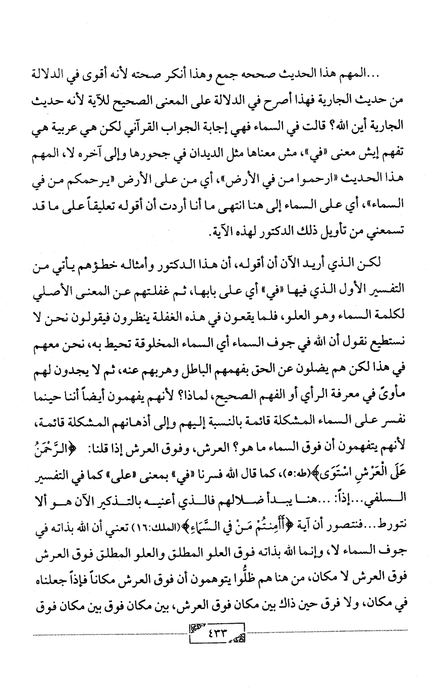 لكن الذي أريد الآن أن أقوله، أن هذا الدكتور وأمثاله خطؤهم يأتي من التفسير الأول الذي فيها «في» أي على بابها، ثم غفلتهم عن المعنى الأصلي لكلمة السماء وهو العلو، فلما يقعون في هذه الغفلة ينظرون فيقولون نحن لا نستطيع نقول أن الله في جوف السماء أي السماء المخلوقة تحيط به، نحن معهم في هذا لكن هم يضلون عن الحق بفهمهم الباطل وهربهم عنه، ثم لا يجدون لهم مأوىً في معرفة الرأي أو الفهم الصحيح، لماذا؟ لأنهم يفهمون أيضاً أننا حينما نفسر على السماء المشكلة قائمة بالنسبة إليهم وإلى أذهانهم المشكلة قائمة، لأنهم يتفهمون أن فوق السماء ما هو؟ العرش، وفوق العرش إذا قلنا: ... {الرَّحْمَنُ عَلَى الْعَرْشِ اسْتَوَى} (طه:5)، كما قال الله فسرنا «في» بمعنى «على» كما في التفسير السلفي ... إذاً: ... هنا يبدأ ضلالهم فالذي أعنيه بالتذكير الآن هو ألا نتورط ... فنتصور أن آية {أَأَمِنتُمْ مَنْ في السَّمَاءِ} (الملك:16) تعني أن الله بذاته في جوف السماء لا، وإنما الله بذاته فوق العلو المطلق والعلو المطلق فوق العرش فوق العرش لا مكان، من هنا هم ظلُّوا يتوهمون أن فوق العرش مكاناً فإذاً جعلناه في مكان، ولا فرق حين ذاك بين مكان فوق العرش، بين مكان فوق بين مكان فوق