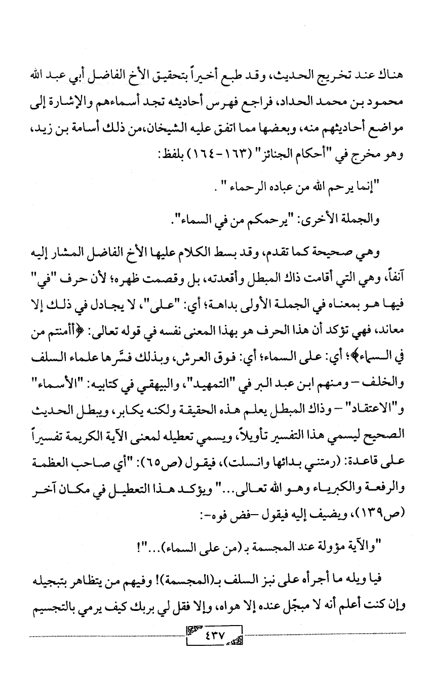 وهي صحيحة كما تقدم، وقد بسط الكلام عليها الأخ الفاضل المشار إليه آنفاً، وهي التي أقامت ذاك المبطل وأقعدته، بل وقصمت ظهره؛ لأن حرف "في" فيها هو بمعناه في الجملة الأولى بداهة؛ أي: "على"، لا يجادل في ذلك إلا معاند، فهي تؤكد أن هذا الحرف هو بهذا المعنى نفسه في قوله تعالى: {أأمنتم من في السماء}؛ أي: على السماء؛ أي: فوق العرش، وبذلك فسَّرها علماء السلف والخلف - ومنهم ابن عبد البر في "التمهيد"، والبيهقي في كتابيه: "الأسماء" و"الاعتقاد" - وذاك المبطل يعلم هذه الحقيقة ولكنه يكابر، ويبطل الحديث الصحيح ليسمي هذا التفسير تأويلاً، ويسمي تعطيله لمعنى الآية الكريمة تفسيراً على قاعدة: (رمتني بدائها وانسلت)، فيقول (ص65): "أي صاحب العظمة والرفعة والكبرياء وهو الله تعالى ... " ويؤكد هذا التعطيل في مكان آخر (ص139)، ويضيف إليه فيقول -فض فوه-: