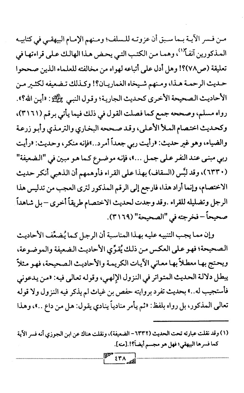 من فسر الآية بما سبق أن عزوته للسلف؛ ومنهم الإمام البيهقي في كتابيه المذكورين آنفاً (¬1)، وهما من الكتب التي يحض هذا الهالك على قراءتها في تعليقة (ص78)؟! وهل أدل على أتباعه لهواه من مخالفته للعلماء الذين صححوا حديث الرحمة هذا، ومنهم شيخاه الغماريان؟! وكذلك تضعيفه لكثير من الأحاديث الصحيحة الأخرى كحديث الجارية؛ وقول النبي - صلى الله عليه وآله وسلم -: «أين الله؟». رواه مسلم، وصححه جمع كما فصلت القول في ذلك فيما يأتي برقم (3161)، وكحديث اختصام الملأ الأعلى، وقد صححه البخاري والترمذي وأبو زرعة والضياء، وهو غير حديث: «رأيت ربي جعداً أمرد .. » فإنه منكر، وحديث: «رأيت ربي مبنى عند النفر على جمل ... »، فإنه موضوع كما هو مبين في "الضعيفة" (6330)، وقد لبَّس (السقاف) بهذا على القراء فأوهمهم أن الذهبي أنكر حديث الاختصام، وإنما أراد هذا، فارجع إلى الرقم المذكور لترى العجب من تدليس هذا الرجل وتضليله للقراء. وقد وجدت لحديث الاختصام طريقاً أخرى - بل شاهداً صحيحاً - فخرجته في "الصحيحة" (3169).