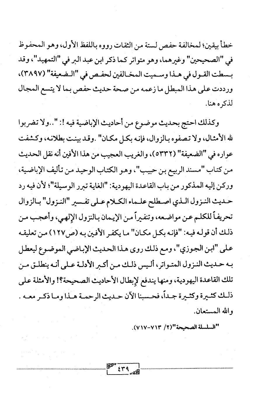 وكذلك احتج بحديث موضوع من أحاديث الإباضية فيه!: " .. ولا تضربوا لله الأمثال، ولا تصفوه بالزوال، فإنه بكل مكان".وقد بينت بطلانه، وكشفت عواره في "الضعيفة" (5332)، والغريب العجيب من هذا الأفين أنه نقل الحديث من كتاب "مسند الربيع بن حبيب"، وهو الكتاب الوحيد من تأليف الإباضية، وركن إليه المذكور من باب القاعدة اليهودية: "الغاية تبرر الوسيلة"؛ لأن فيه رد حديث النزول الذي اصطلح علماء الكلام على تفسير "النزول" بالزوال