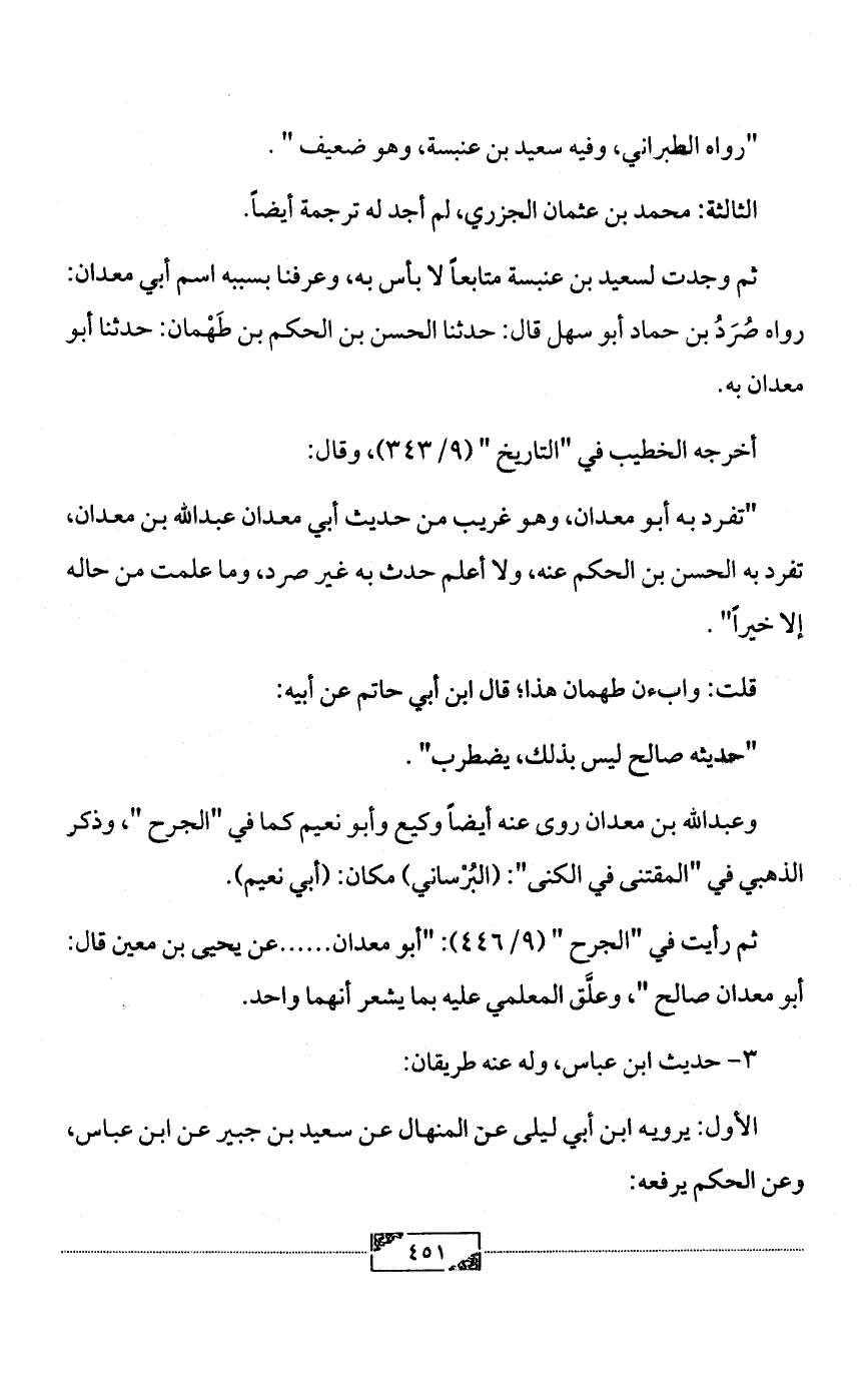 ثم وجدت لسعيد بن عنبسة متابعاً لا بأس به، وعرفنا بسببه اسم أبي معدان: رواه صُرَدُ بن حماد أبو سهل قال: حدثنا الحسن بن الحكم بن طَهْمان: حدثنا أبو معدان به.