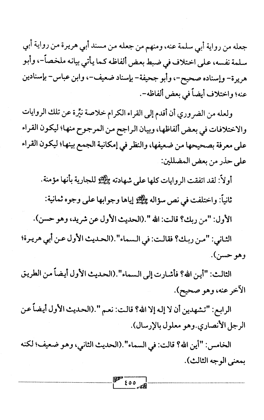 الخامس: "أين الله؟ قالت: في السماء". (الحديث الثاني، وهو ضعيف؛ لكنه بمعنى الوجه الثالث).
