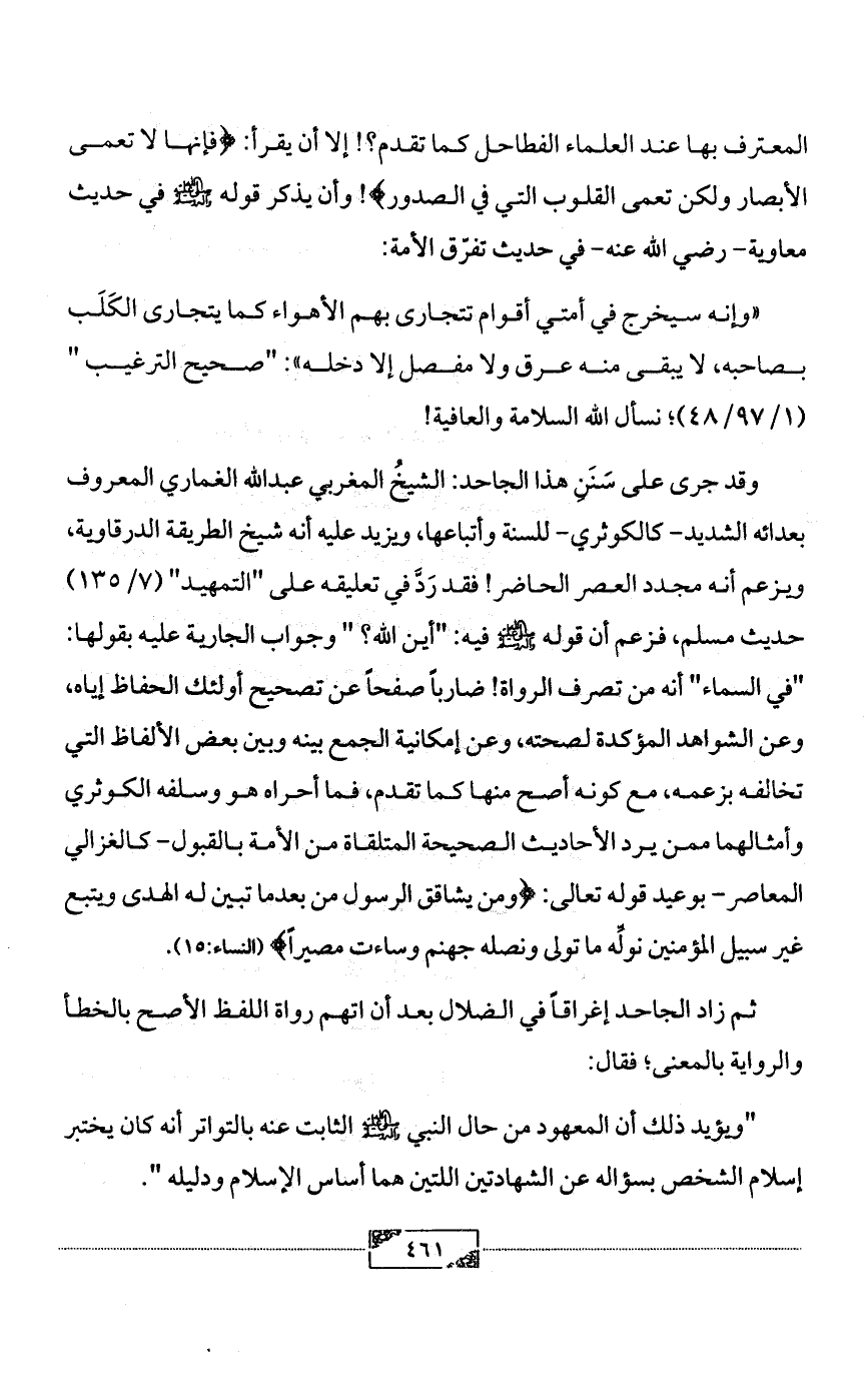 وقد جرى على سَنَنِ هذا الجاحد: الشيخُ المغربي عبد الله الغماري المعروف بعدائه الشديد- كالكوثري- للسنة وأتباعها، ويزيد عليه أنه شيخ الطريقة الدرقاوية، ويزعم أنه مجدد العصر الحاضر! فقد رَدَّ في تعليقه على "التمهيد" (7/ 135) حديث مسلم، فزعم أن قوله - صلى الله عليه وآله وسلم - فيه: "أين الله؟ " وجواب الجارية عليه بقولها: "في السماء" أنه من تصرف الرواة! ضارباً صفحاً عن تصحيح أولئك الحفاظ إياه، وعن الشواهد المؤكدة لصحته، وعن إمكانية الجمع بينه وبين بعض الألفاظ التي تخالفه بزعمه، مع كونه أصح منها كما تقدم، فما أحراه هو وسلفه الكوثري وأمثالهما ممن يرد الأحاديث الصحيحة المتلقاة من الأمة بالقبول- كالغزالي المعاصر- بوعيد قوله تعالى: {ومن يشاقق الرسول من بعدما تبين له الهدى ويتبع غير سبيل المؤمنين نولِّه ما تولى ونصله جهنم وساءت مصيراً} (النساء:15).