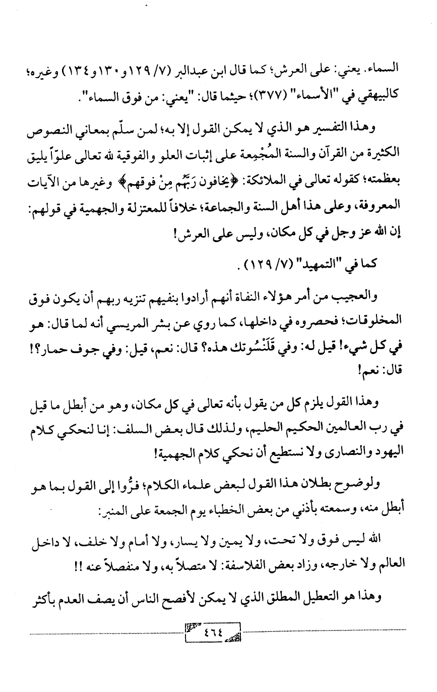 والعجيب من أمر هؤلاء النفاة أنهم أرادوا بنفيهم تنزيه ربهم أن يكون فوق المخلوقات؛ فحصروه في داخلها، كما روي عن بشر المريسي أنه لما قال: هو