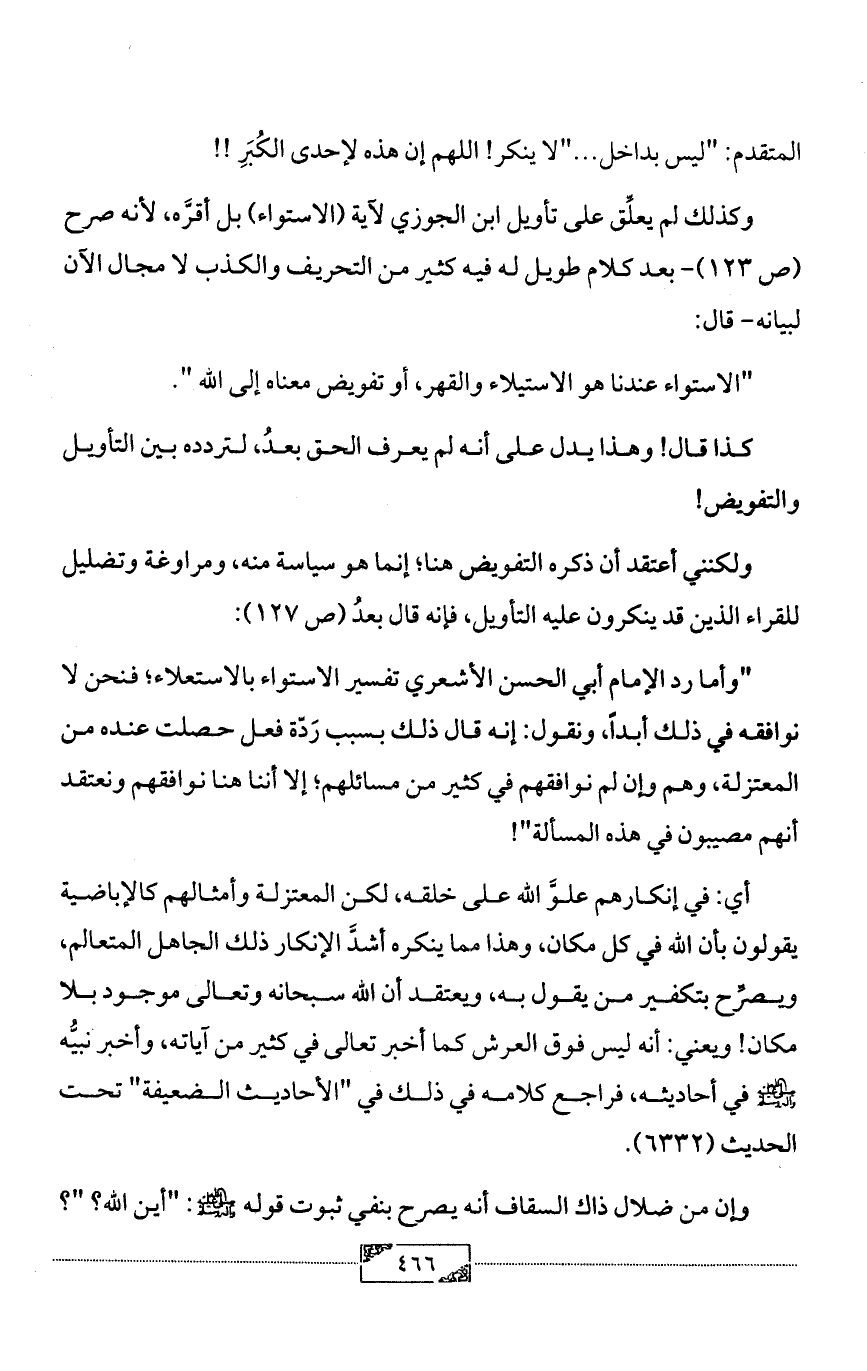 وكذلك لم يعلِّق على تأويل ابن الجوزي لآية (الاستواء) بل أقرَّه، لأنه صرح (ص 123) - بعد كلام طويل له فيه كثير من التحريف والكذب لا مجال الآن لبيانه- قال:
