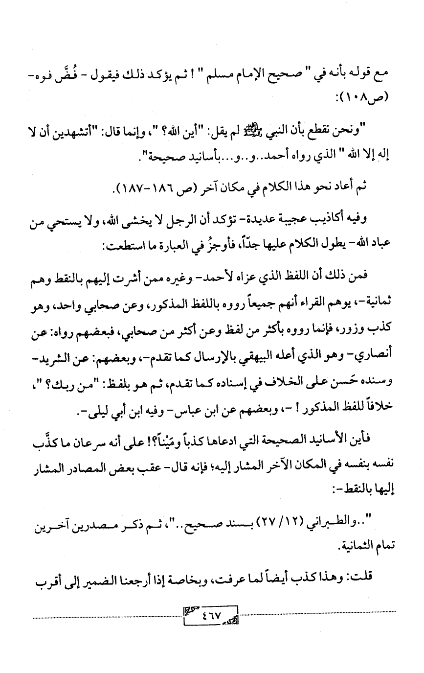 "ونحن نقطع بأن النبي - صلى الله عليه وآله وسلم - لم يقل: "أين الله؟ "، وإنما قال: "أتشهدين أن لا إله إلا الله " الذي رواه أحمد .. و .. و ... بأسانيد صحيحة".