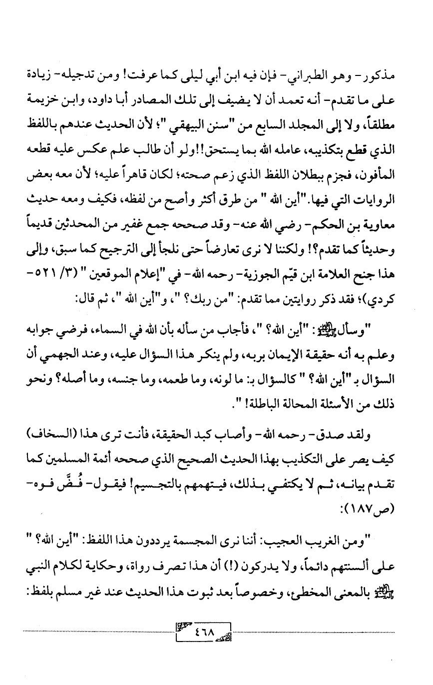 "ومن الغريب العجيب: أننا نرى المجسمة يرددون هذا اللفظ: "أين الله؟ " على ألسنتهم دائماً، ولا يدركون (!) أن هذا تصرف رواة، وحكاية لكلام النبي - صلى الله عليه وآله وسلم - بالمعنى المخطئ، وخصوصاً بعد ثبوت هذا الحديث عند غير مسلم بلفظ: