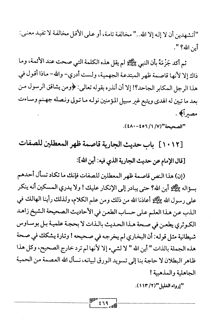 (إن) هذا النص قاصمة ظهر المعطلين للصفات فإنك ما تكاد تسأل أحدهم بسؤاله - صلى الله عليه وآله وسلم - أين الله؟ حتى يبادر إلى الإنكار عليك! ولا يدري المسكين أنه ينكر على رسول الله - صلى الله عليه وآله وسلم - أعاذنا الله من ذلك ومن علم الكلام، ولذلك رأينا الهالك في الذب عن هذا العلم على حساب الطعن في الأحاديث الصحيحة الشيخ زاهد الكوثري يطعن في صحة هذا الحديث بالذات لا بحجة علمية بل بوساوس شيطانية مثل قوله: أن البخاري لم يخرجه في صحيحه! وتارة يشكك في صحة هذه الجملة بالذات " أين الله " لا لشيء إلا لأنها لم ترد خارج الصحيح، وكل هذا ظاهر البطلان لا حاجة بنا إلى تسويد الورق لبيانه، نسأل الله العصمة من الحمية الجاهلية والمذهبية!