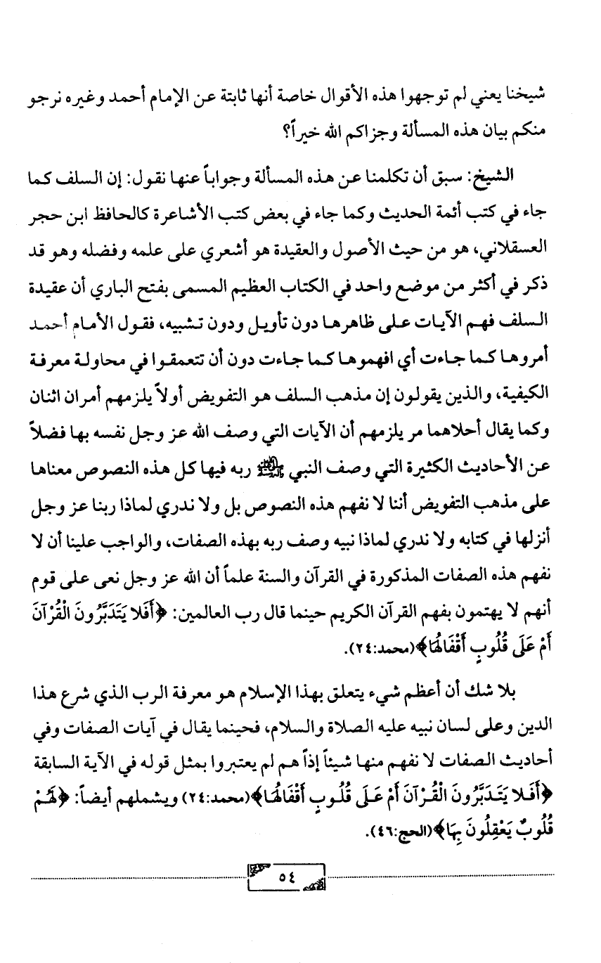 بلا شك أن أعظم شيء يتعلق بهذا الإسلام هو معرفة الرب الذي شرع هذا الدين وعلى لسان نبيه عليه الصلاة والسلام, فحينما يقال في آيات الصفات وفي أحاديث الصفات لا نفهم منها شيئاً إذاً هم لم يعتبروا بمثل قوله في الآية السابقة {أَفَلا يَتَدَبَّرُونَ الْقُرْآنَ أَمْ عَلَى قُلُوبٍ أَقْفَالُهَا} (محمد:24) ويشملهم أيضاً: {لَهُمْ قُلُوبٌ يَعْقِلُونَ بِهَا} (الحج:46).