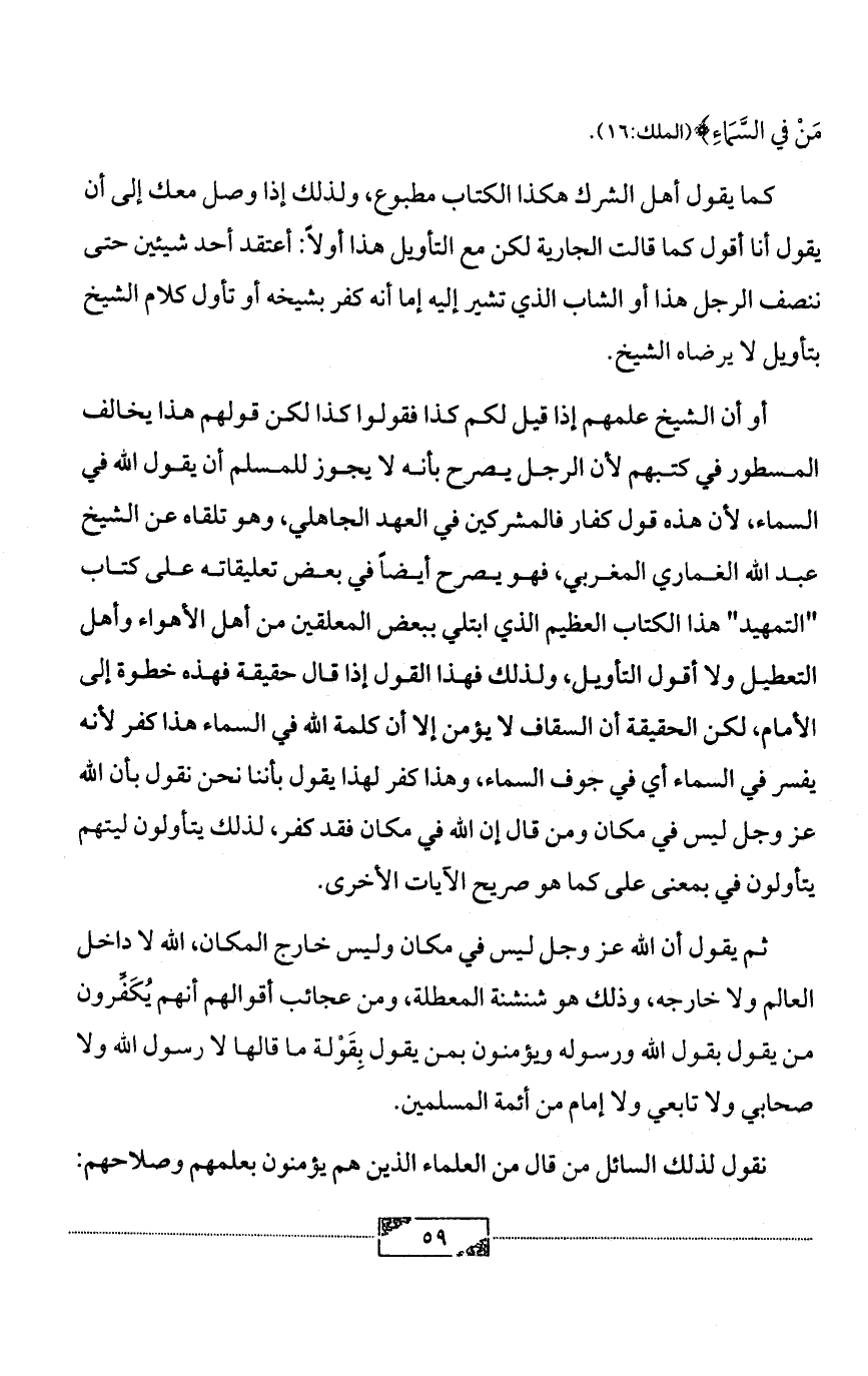 أو أن الشيخ علمهم إذا قيل لكم كذا فقولوا كذا لكن قولهم هذا يخالف المسطور في كتبهم لأن الرجل يصرح بأنه لا يجوز للمسلم أن يقول الله في السماء، لأن هذه قول كفار فالمشركين في العهد الجاهلي، وهو تلقاه عن الشيخ عبد الله الغماري المغربي، فهو يصرح أيضاً في بعض تعليقاته على كتاب "التمهيد" هذا الكتاب العظيم الذي ابتلي ببعض المعلقين من أهل الأهواء وأهل التعطيل ولا أقول التأويل, ولذلك فهذا القول إذا قال حقيقة فهذه خطوة إلى الأمام، لكن الحقيقة أن السقاف لا يؤمن إلا أن كلمة الله في السماء هذا كفر لأنه يفسر في السماء أي في جوف السماء، وهذا كفر لهذا يقول بأننا نحن نقول بأن الله عز وجل ليس في مكان ومن قال إن الله في مكان فقد كفر، لذلك يتأولون ليتهم يتأولون في بمعنى على كما هو صريح الآيات الأخرى.
