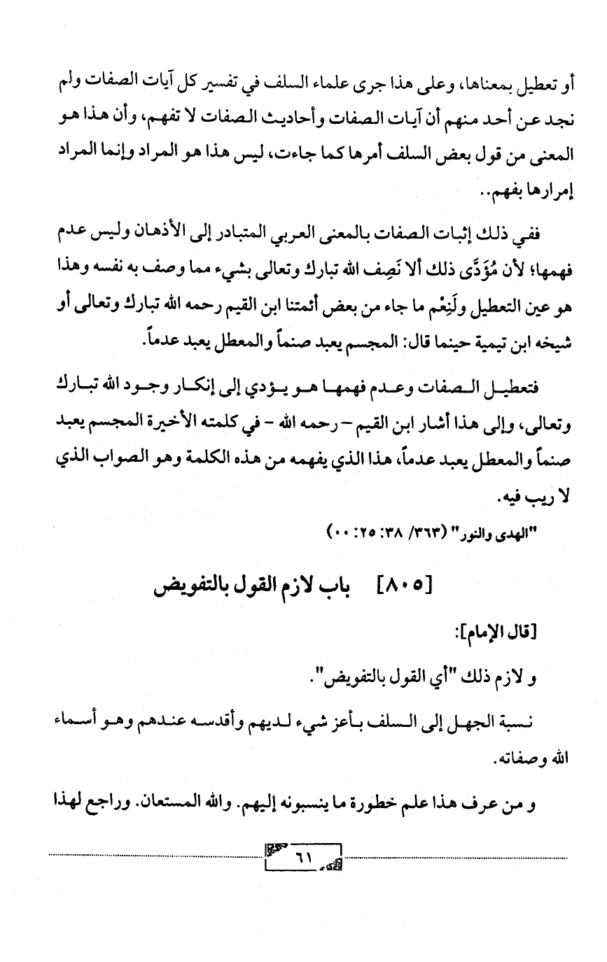 ففي ذلك إثبات الصفات بالمعنى العربي المتبادر إلى الأذهان وليس عدم فهمها؛ لأن مُؤَدَّى ذلك ألا نَصِف الله تبارك وتعالى بشيء مما وصف به نفسه وهذا هو عين التعطيل ولَنِعْم ما جاء من بعض أئمتنا ابن القيم رحمه الله تبارك وتعالى أو شيخه ابن تيمية حينما قال: المجسم يعبد صنماً والمعطل يعبد عدماً.