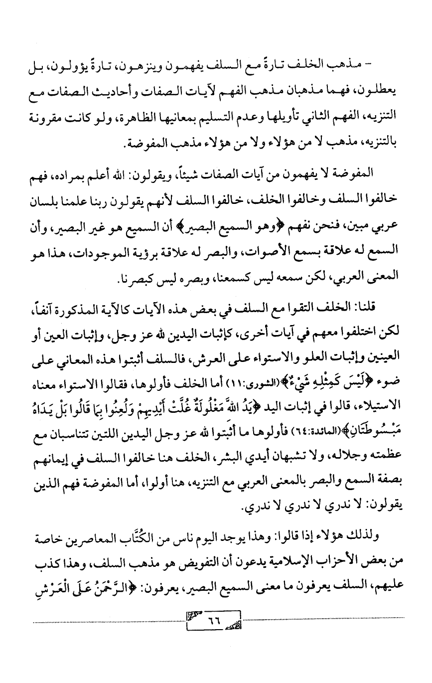 قلنا: الخلف التقوا مع السلف في بعض هذه الآيات كالآية المذكورة آنفاً، لكن اختلفوا معهم في آيات أخرى، كإثبات اليدين لله عز وجل، وإثبات العين أو العينين وإثبات العلو والاستواء على العرش، فالسلف أثبتوا هذه المعاني على ضوء {لَيْسَ كَمِثْلِهِ شَيْءٌ} (الشورى:11) أما الخلف فأولوها، فقالوا الاستواء معناه الاستيلاء، قالوا في إثبات اليد {يَدُ اللَّهِ مَغْلُولَةٌ غُلَّتْ أَيْدِيهِمْ وَلُعِنُوا بِمَا قَالُوا بَلْ يَدَاهُ مَبْسُوطَتَانِ} (المائدة:64) فأولوها ما أثبتوا لله عز وجل اليدين اللتين تتناسبان مع عظمته وجلاله، ولا تشبهان أيدي البشر، الخلف هنا خالفوا السلف في إيمانهم بصفة السمع والبصر بالمعنى العربي مع التنزيه، هنا أولوا، أما المفوضة فهم الذين يقولون: لا ندري لا ندري لا ندري.