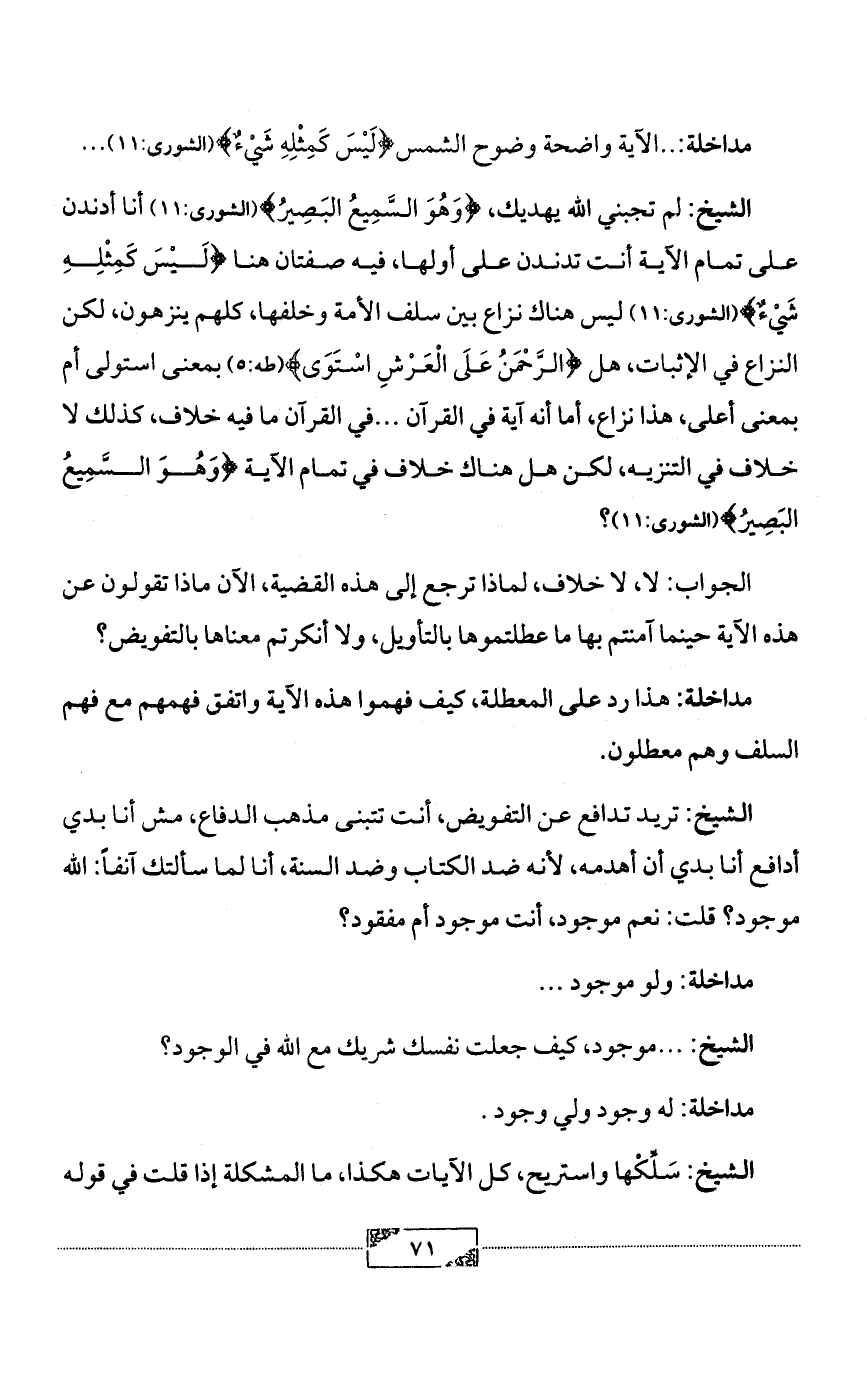 الشيخ: تريد تدافع عن التفويض، أنت تتبنى مذهب الدفاع، مش أنا بدي أدافع أنا بدي أن أهدمه، لأنه ضد الكتاب وضد السنة، أنا لما سألتك آنفاً: الله موجود؟ قلت: نعم موجود، أنت موجود أم مفقود؟
