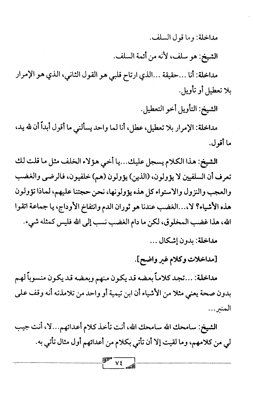 الشيخ: هذا الكلام يسجل عليك ... يا أخي هؤلاء الخلف مثل ما قلت لك تعرف أن السلفيين لا يؤولون، (الذين) يؤولون (هم) خلفيون، فالرضى والغضب والعجب والنزول والاستواء كل هذه يؤولونها، نحن حجتنا عليهم، لماذا تؤولون هذه الأشياء؟ لا، ... الغضب عندنا هو ثوران الدم وانتفاخ الأوداج، يا جماعة اتقوا الله، هذا غضب المخلوق، لكن ما دام الغضب نسب إلى الله فليس كمثله شيء.