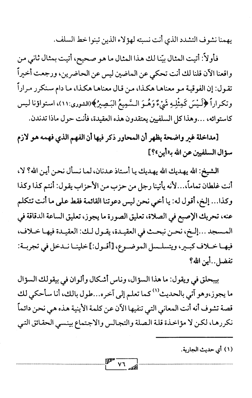 الشيخ: الله يهديك الله يهديك يا أستاذ عدنان، لما نسأل نحن أين الله؟ لا، أنت غلطان تماماً، ... لأنه يأتينا رجل من حزب من الأحزاب يقول: أنتم كذا وكذا وكذا ... إلخ، أقول له: يا أخي نحن ليس دعوتنا القائمة فقط على ما أنت تتكلم عنه، تحريك الإصبع في الصلاة، تعليق الصورة ما يجوز، تعليق الساعة الدقاقة في المسجد ... إلخ، نحن نبحث في العقيدة، يقول لك: العقيدة فيها خلاف،