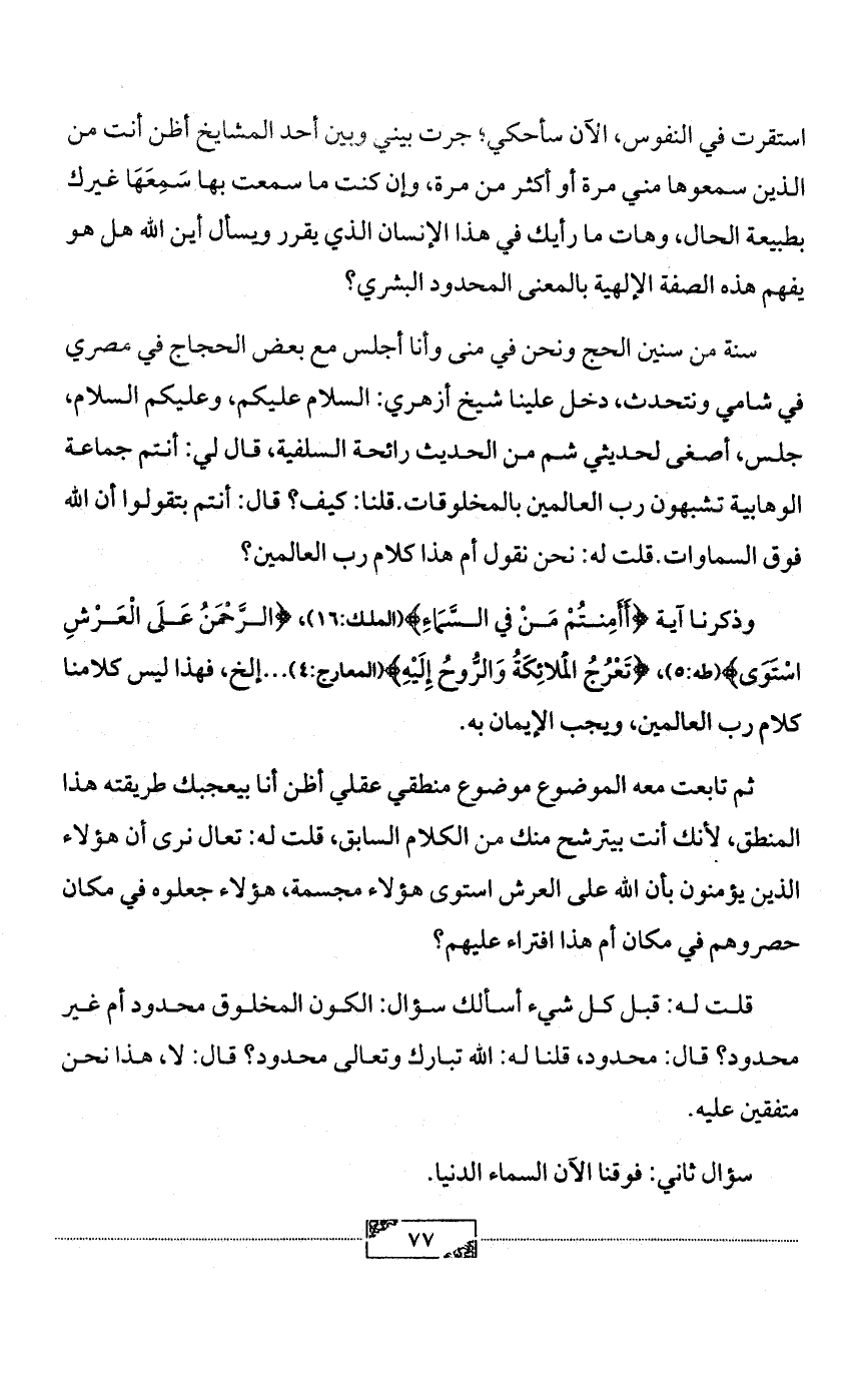 سنة من سنين الحج ونحن في منى وأنا أجلس مع بعض الحجاج في مصري في شامي ونتحدث، دخل علينا شيخ أزهري: السلام عليكم، وعليكم السلام، جلس، أصغى لحديثي شم من الحديث رائحة السلفية، قال لي: أنتم جماعة الوهابية تشبهون رب العالمين بالمخلوقات. قلنا: كيف؟ قال: أنتم بتقولوا أن الله فوق السماوات. قلت له: نحن نقول أم هذا كلام رب العالمين؟