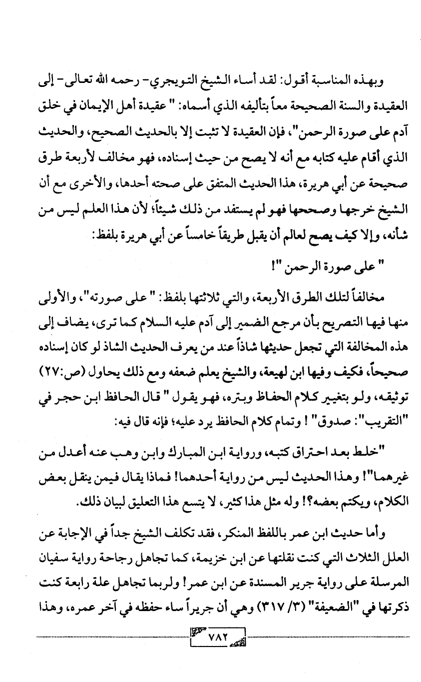 وبهذه المناسبة أقول: لقد أساء الشيخ التويجري- رحمه الله تعالى- إلى العقيدة والسنة الصحيحة معاً بتأليفه الذي أسماه: " عقيدة أهل الإيمان في خلق آدم على صورة الرحمن"، فإن العقيدة لا تثبت إلا بالحديث الصحيح، والحديث الذي أقام عليه كتابه مع أنه لا يصح من حيث إسناده، فهو مخالف لأربعة طرق صحيحة عن أبي هريرة، هذا الحديث المتفق على صحته أحدها، والأخرى مع أن الشيخ خرجها وصححها فهو لم يستفد من ذلك شيئاً؛ لأن هذا العلم ليس من شأنه، وإلا كيف يصح لعالم أن يقبل طريقاً خامساً عن أبي هريرة بلفظ: