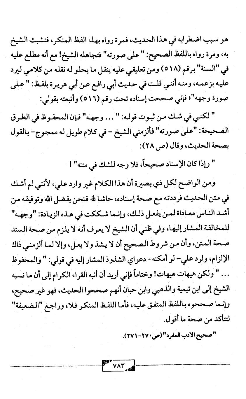 ومن الواضح لكل ذي بصيرة أن هذا الكلام غير وارد علي، لأنني لم أشك في متن الحديث فرددته مع صحة إسناده، حاشا لله فنحن بفضل الله وتوفيقه من أشد الناس معاداة لمن يفعل ذلك، وإنما شككت في هذه الزيادة: "وجهه" للمخالفة المشار إليها، وفي ظني أن الشيخ لا يعرف أنه لا يلزم من صحة السند صحة المتن، وأن من شروط الصحيح أن لا يشذ ولا يعل، وإلا لما ألزمني ذاك الإلزام، ولرد علي- لو أمكنه- دعواي الشذوذ المشار إليه في قولي: " والمحفوظ ... " ولكن هيهات هيهات! وختاماً فإني أريد أن أنبه القراء الكرام إلى أن ما نسبه الشيخ إلى ابن تيمية والذهبي وابن حبان أنهم صححوا الحديث، فهو غير صحيح، وإنما صححوه باللفظ المتفق عليه، فأما اللفظ المنكر فلا، وراجع "الضعيفة" لتتأكد من صحة ما أقول.