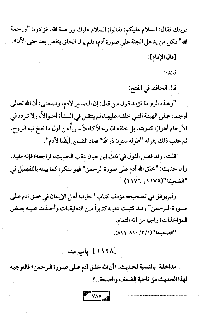 ولم يوفق في تصحيحه مؤلف كتاب "عقيدة أهل الإيمان في خلق آدم على صورة الرحمن" وقد كتبت عليه كثيراً من التعليقات وأخذت عليه بعض المؤاخذات؛ راجيا من الله التمام.