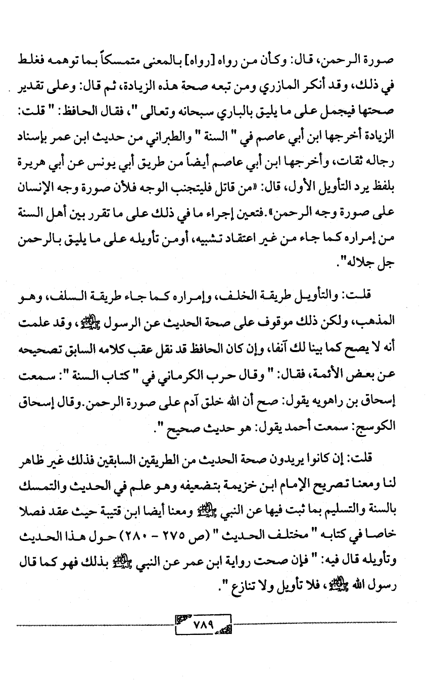 صورة الرحمن، قال: وكأن من رواه [رواه] بالمعنى متمسكاً بما توهمه فغلط في ذلك، وقد أنكر المازري ومن تبعه صحة هذه الزيادة، ثم قال: وعلى تقدير صحتها فيجمل على ما يليق بالباري سبحانه وتعالى "، فقال الحافظ: " قلت: الزيادة أخرجها ابن أبي عاصم في " السنة " والطبراني من حديث ابن عمر بإسناد رجاله ثقات، وأخرجها ابن أبي عاصم أيضاً من طريق أبي يونس عن أبي هريرة بلفظ يرد التأويل الأول، قال: «من قاتل فليتجنب الوجه فلأن صورة وجه الإنسان على صورة وجه الرحمن».فتعين إجراء ما في ذلك على ما تقرر بين أهل السنة من إمراره كما جاء من غير اعتقاد تشبيه، أومن تأويله على ما يليق بالرحمن