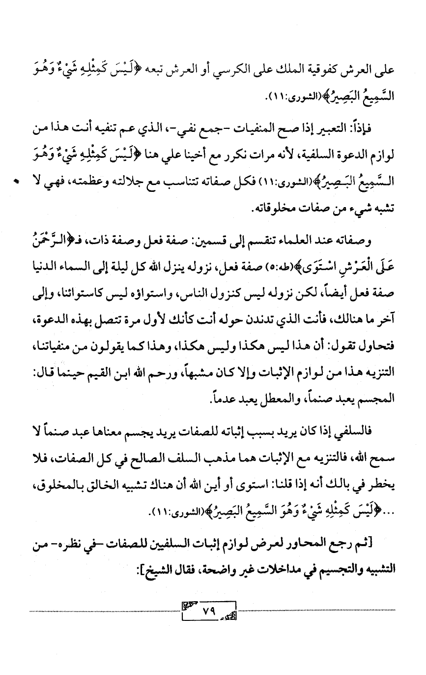 فإذاً: التعبير إذا صح المنفيات -جمع نفي-، الذي عم تنفيه أنت هذا من لوازم الدعوة السلفية، لأنه مرات نكرر مع أخينا علي هنا {لَيْسَ كَمِثْلِهِ شَيْءٌ وَهُوَ السَّمِيعُ البَصِيرُ} (الشورى:11) فكل صفاته تتناسب مع جلالته وعظمته، فهي لا تشبه شيء من صفات مخلوقاته.