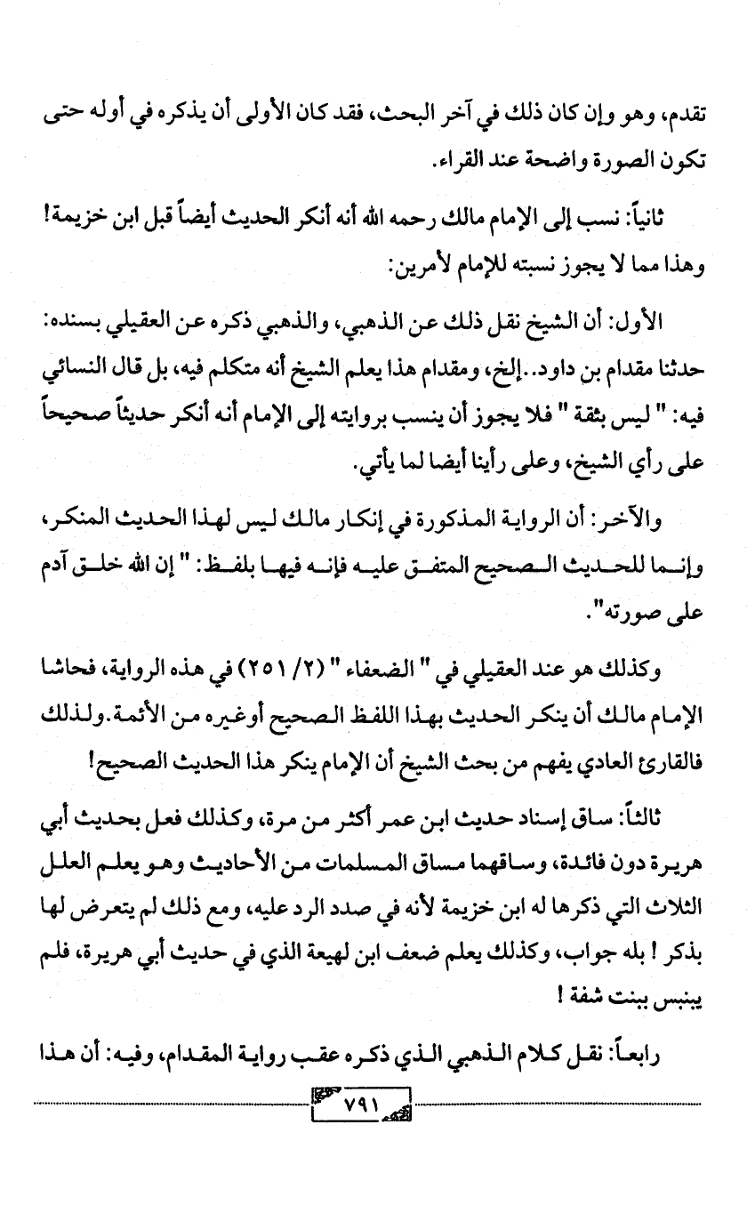 وكذلك هو عند العقيلي في " الضعفاء " (2/ 251) في هذه الرواية، فحاشا الإمام مالك أن ينكر الحديث بهذا اللفظ الصحيح أوغيره من الأئمة. ولذلك فالقارئ العادي يفهم من بحث الشيخ أن الإمام ينكر هذا الحديث الصحيح!