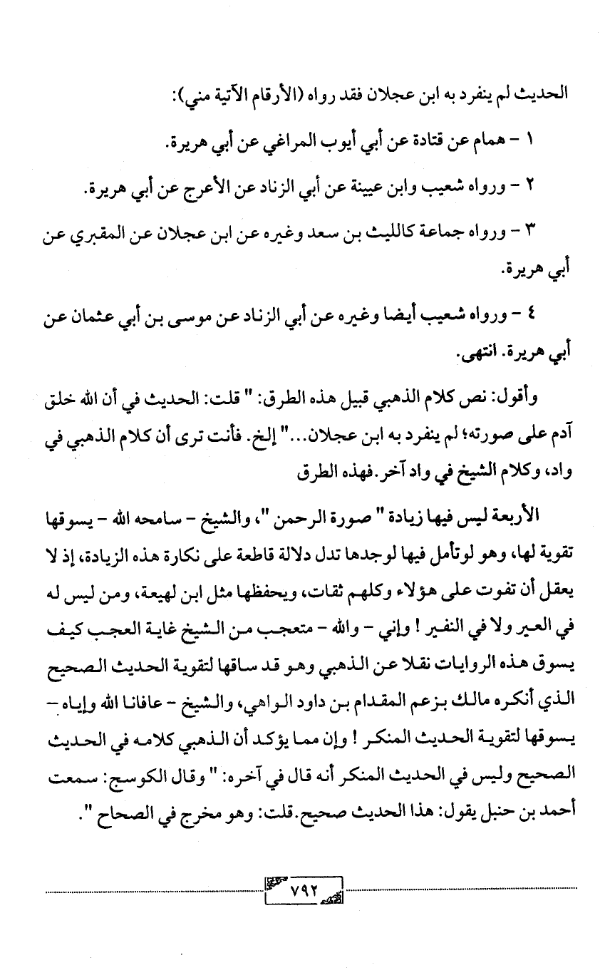 وأقول: نص كلام الذهبي قبيل هذه الطرق: " قلت: الحديث في أن الله خلق آدم على صورته؛ لم ينفرد به ابن عجلان ... " إلخ. فأنت ترى أن كلام الذهبي في واد، وكلام الشيخ في واد آخر. فهذه الطرق