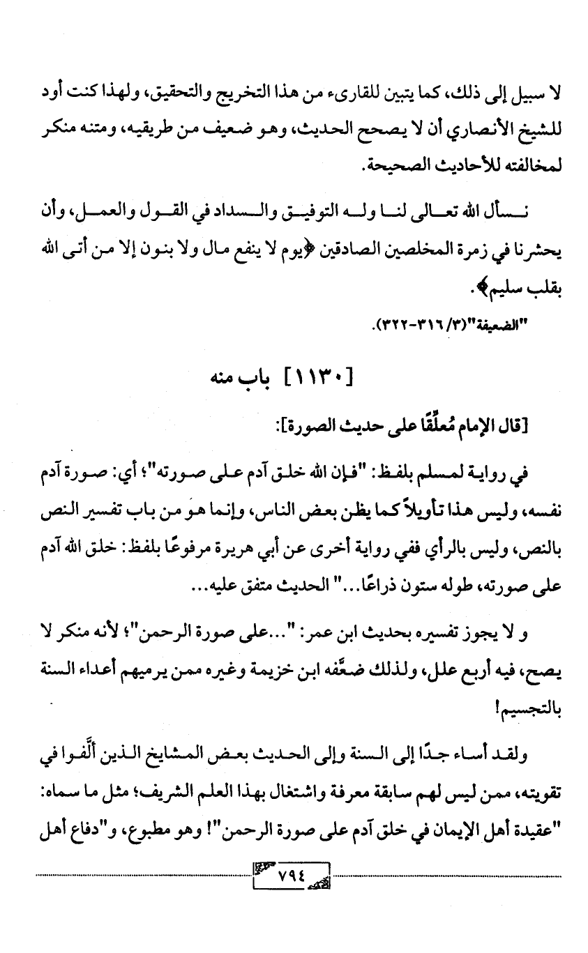 ولقد أساء جدًا إلى السنة وإلى الحديث بعض المشايخ الذين ألَّفوا في تقويته, ممن ليس لهم سابقة معرفة واشتغال بهذا العلم الشريف؛ مثل ما سماه: "عقيدة أهل الإيمان في خلق آدم على صورة الرحمن"! وهو مطبوع, و"دفاع أهل