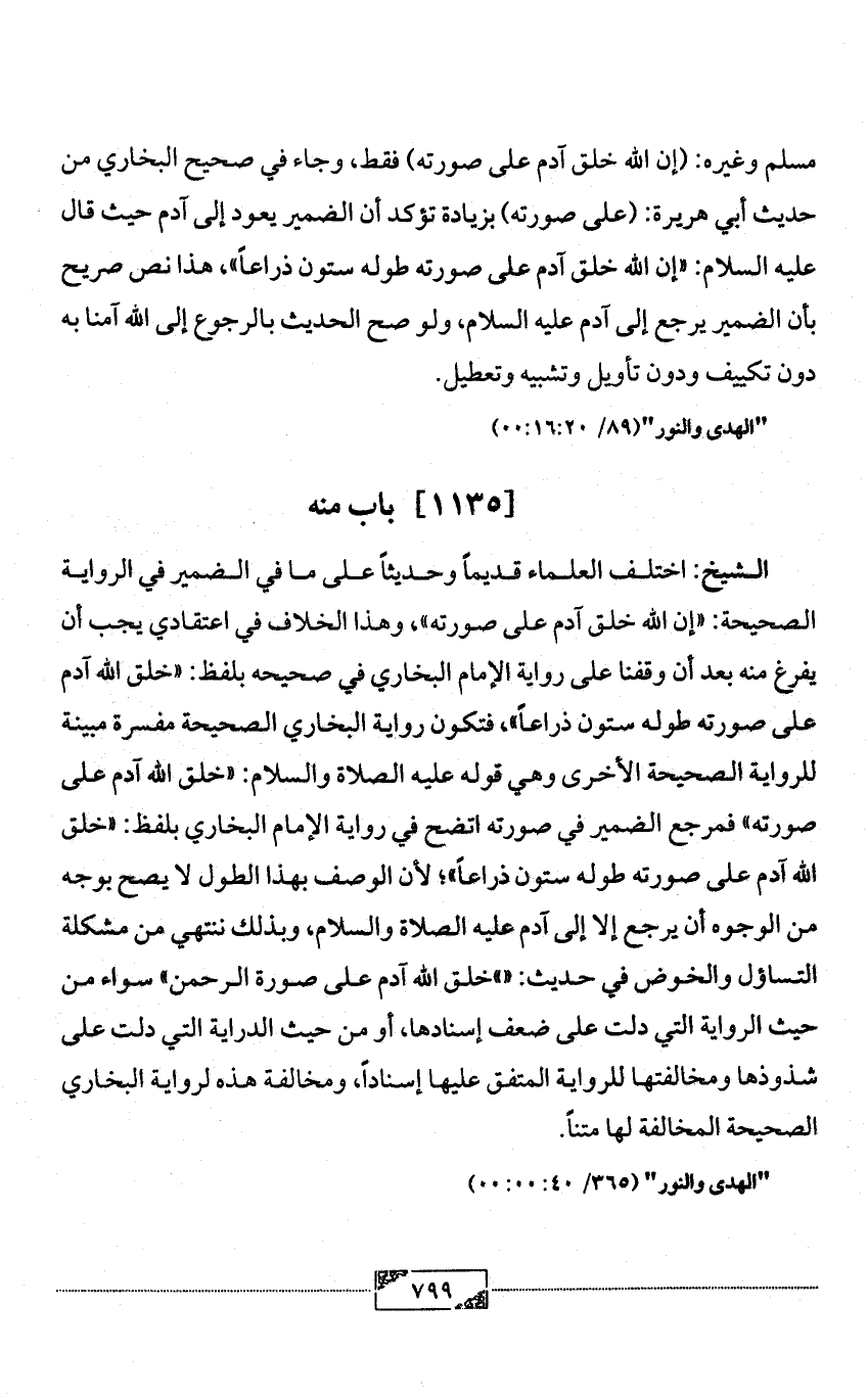 مسلم وغيره: (إن الله خلق آدم على صورته) فقط، وجاء في صحيح البخاري من حديث أبي هريرة: (على صورته) بزيادة تؤكد أن الضمير يعود إلى آدم حيث قال عليه السلام: «إن الله خلق آدم على صورته طوله ستون ذراعاً»، هذا نص صريح بأن الضمير يرجع إلى آدم عليه السلام، ولو صح الحديث بالرجوع إلى الله آمنا به دون تكييف ودون تأويل وتشبيه وتعطيل.