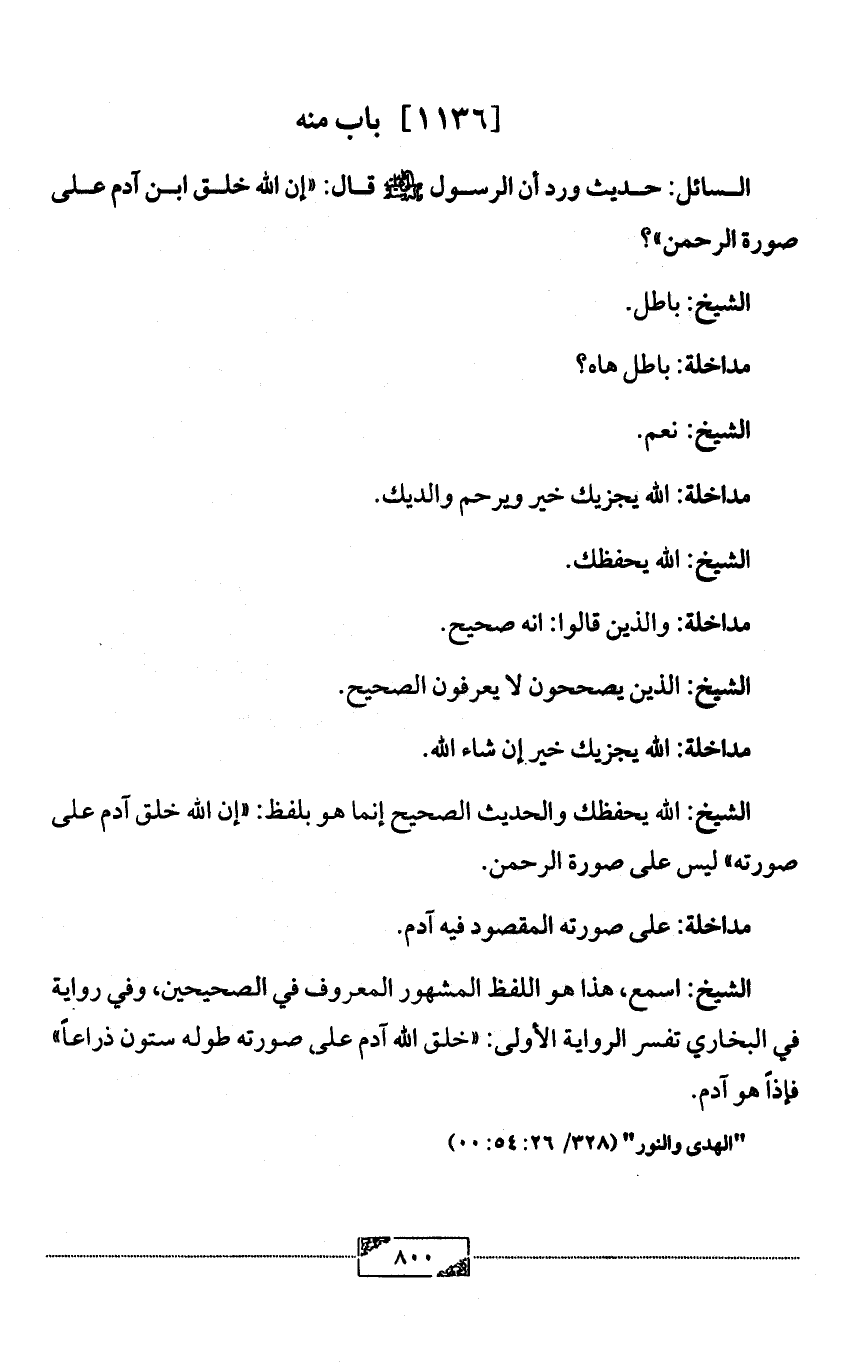 الشيخ: الله يحفظك والحديث الصحيح إنما هو بلفظ: «إن الله خلق آدم على صورته» ليس على صورة الرحمن.