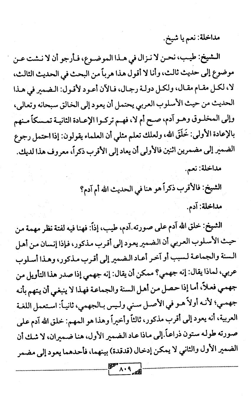 الشيخ: طيب، نحن لا نزال في هذا الموضوع، فأرجو أن لا نشت عن موضوع إلى حديث ثالث، وأنا لا أقول هذا هرباً من البحث في الحديث الثالث، لا، لكل مقام مقال، ولكل دولة رجال، فالآن أعود لأقول: الضمير في هذا الحديث من حيث الأسلوب العربي يحتمل أن يعود إلى الخالق سبحانه وتعالى، وإلى المخلوق وهو آدم، صح أم لا، فهم تركوا الإعادة الثانية تمسكاً منهم بالإعادة الأولى: خَلَقَ الله، ولعلك تعلم مثلي أن العلماء يقولون: إذا احتمل رجوع الضمير إلى مضمرين اثنين فالأولى أن يعاد إلى الأقرب ذكراً، معروف هذا لديك.