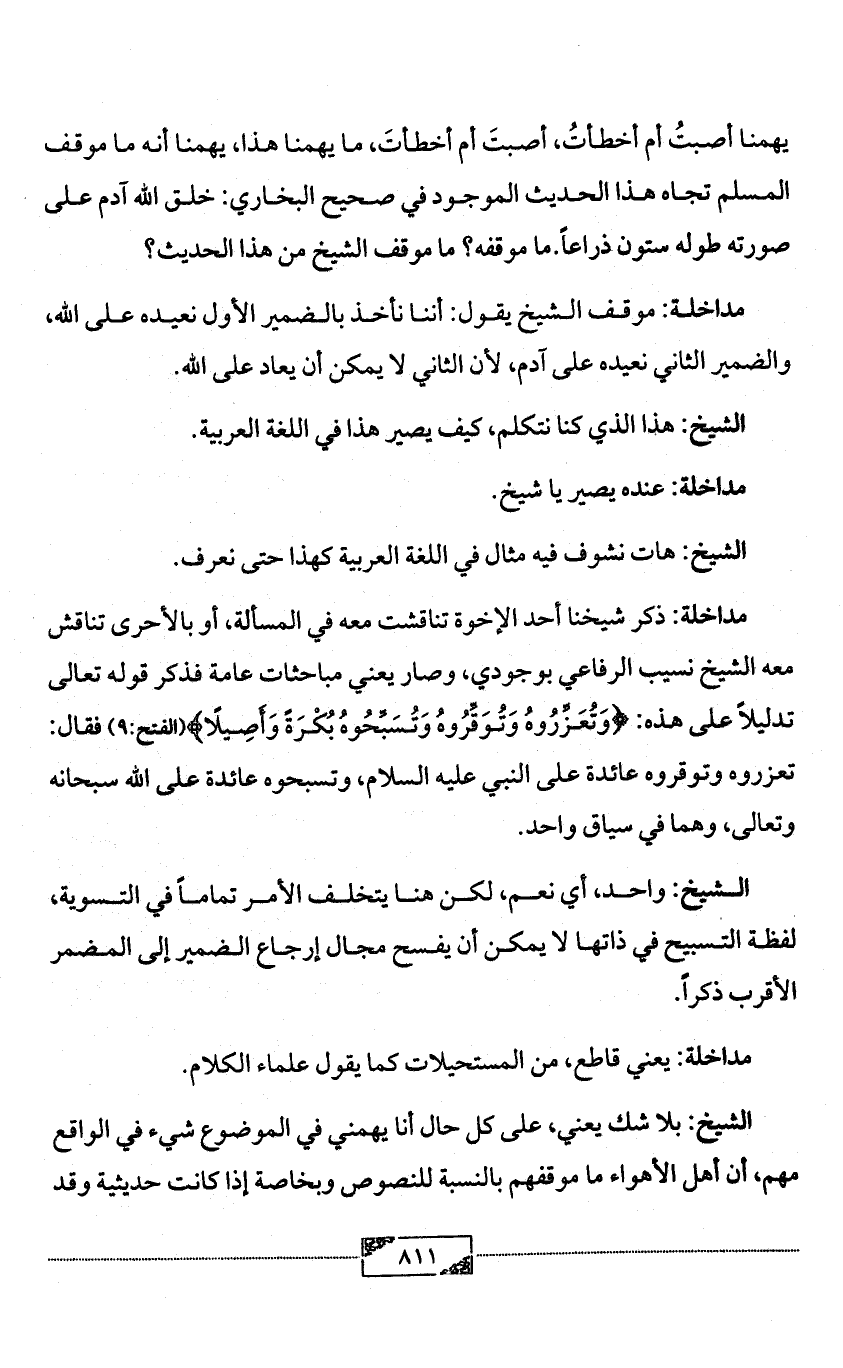 مداخلة: ذكر شيخنا أحد الإخوة تناقشت معه في المسألة، أو بالأحرى تناقش معه الشيخ نسيب الرفاعي بوجودي، وصار يعني مباحثات عامة فذكر قوله تعالى تدليلاً على هذه: {وَتُعَزِّرُوهُ وَتُوَقِّرُوهُ وَتُسَبِّحُوهُ بُكْرَةً وَأَصِيلًا} (الفتح:9) فقال: تعزروه وتوقروه عائدة على النبي عليه السلام، وتسبحوه عائدة على الله سبحانه وتعالى، وهما في سياق واحد.