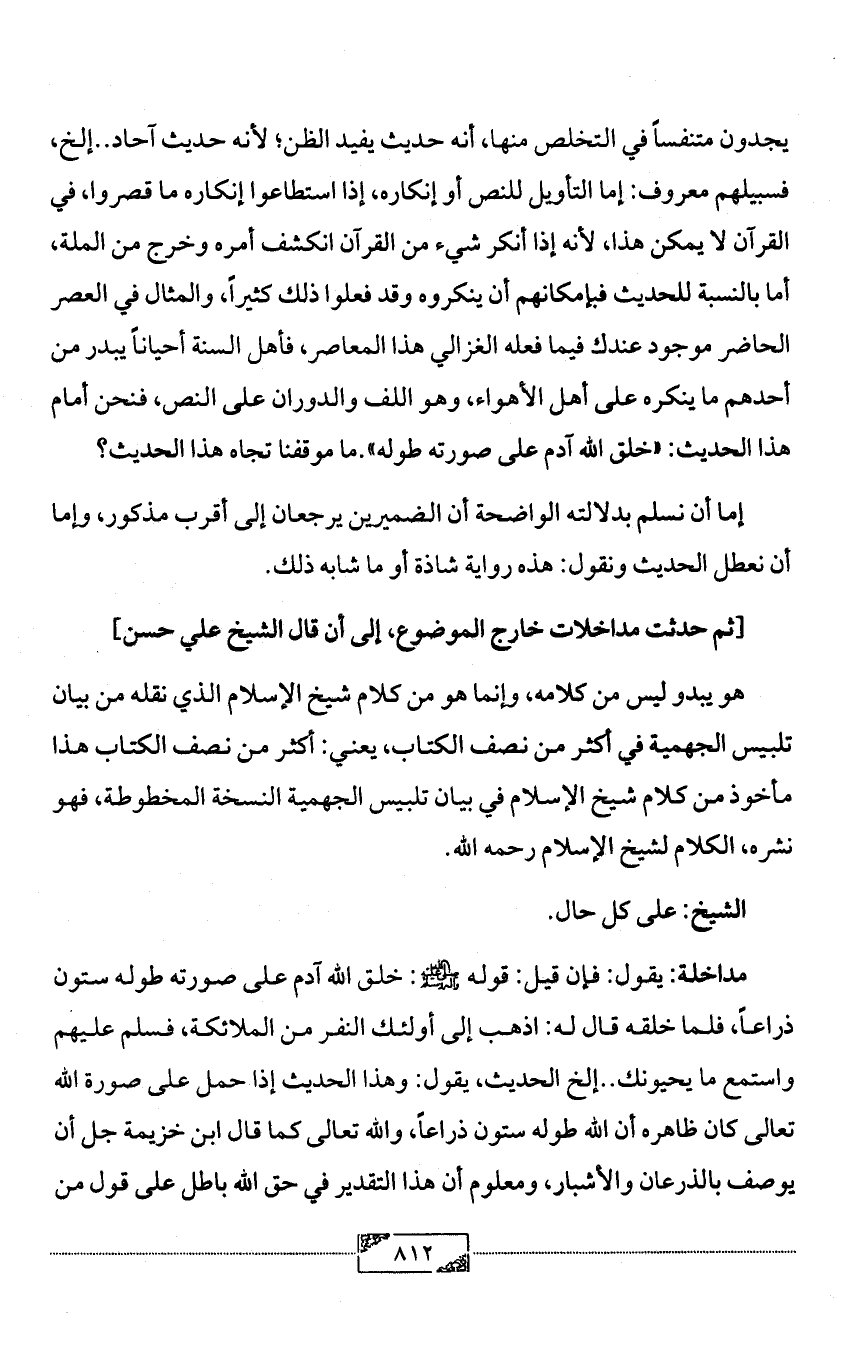يجدون متنفساً في التخلص منها، أنه حديث يفيد الظن؛ لأنه حديث آحاد .. إلخ، فسبيلهم معروف: إما التأويل للنص أو إنكاره، إذا استطاعوا إنكاره ما قصروا، في القرآن لا يمكن هذا، لأنه إذا أنكر شيء من القرآن انكشف أمره وخرج من الملة، أما بالنسبة للحديث فبإمكانهم أن ينكروه وقد فعلوا ذلك كثيراً، والمثال في العصر الحاضر موجود عندك فيما فعله الغزالي هذا المعاصر، فأهل السنة أحياناً يبدر من أحدهم ما ينكره على أهل الأهواء، وهو اللف والدوران على النص، فنحن أمام هذا الحديث: «خلق الله آدم على صورته طوله».ما موقفنا تجاه هذا الحديث؟