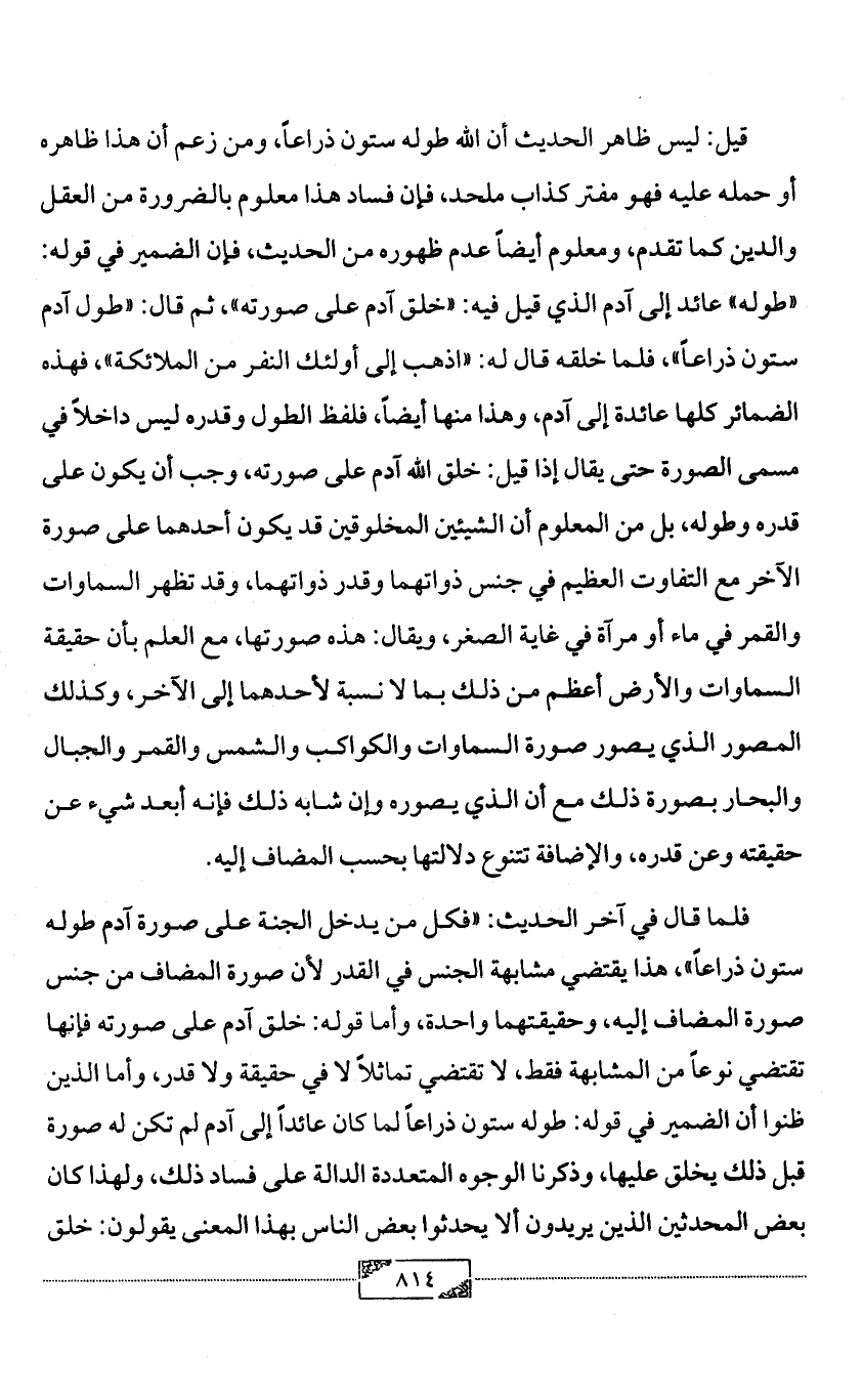 فلما قال في آخر الحديث: «فكل من يدخل الجنة على صورة آدم طوله ستون ذراعاً»، هذا يقتضي مشابهة الجنس في القدر لأن صورة المضاف من جنس صورة المضاف إليه، وحقيقتهما واحدة، وأما قوله: خلق آدم على صورته فإنها تقتضي نوعاً من المشابهة فقط، لا تقتضي تماثلاً لا في حقيقة ولا قدر، وأما الذين ظنوا أن الضمير في قوله: طوله ستون ذراعاً لما كان عائداً إلى آدم لم تكن له صورة قبل ذلك يخلق عليها، وذكرنا الوجوه المتعددة الدالة على فساد ذلك، ولهذا كان بعض المحدثين الذين يريدون ألا يحدثوا بعض الناس بهذا المعنى يقولون: خلق