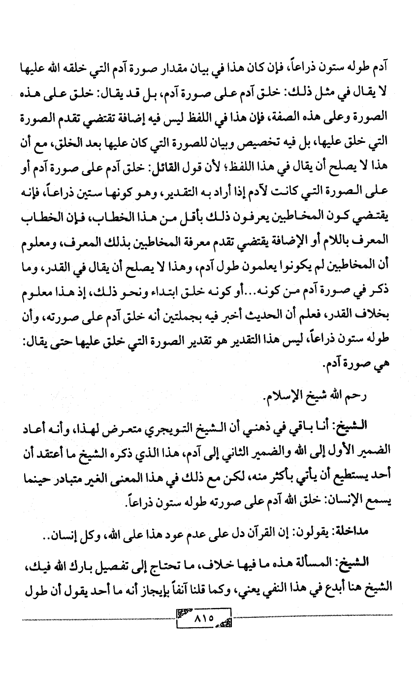 الشيخ: أنا باقي في ذهني أن الشيخ التويجري متعرض لهذا، وأنه أعاد الضمير الأول إلى الله والضمير الثاني إلى آدم، هذا الذي ذكره الشيخ ما أعتقد أن أحد يستطيع أن يأتي بأكثر منه، لكن مع ذلك في هذا المعنى الغير متبادر حينما يسمع الإنسان: خلق الله آدم على صورته طوله ستون ذراعاً.